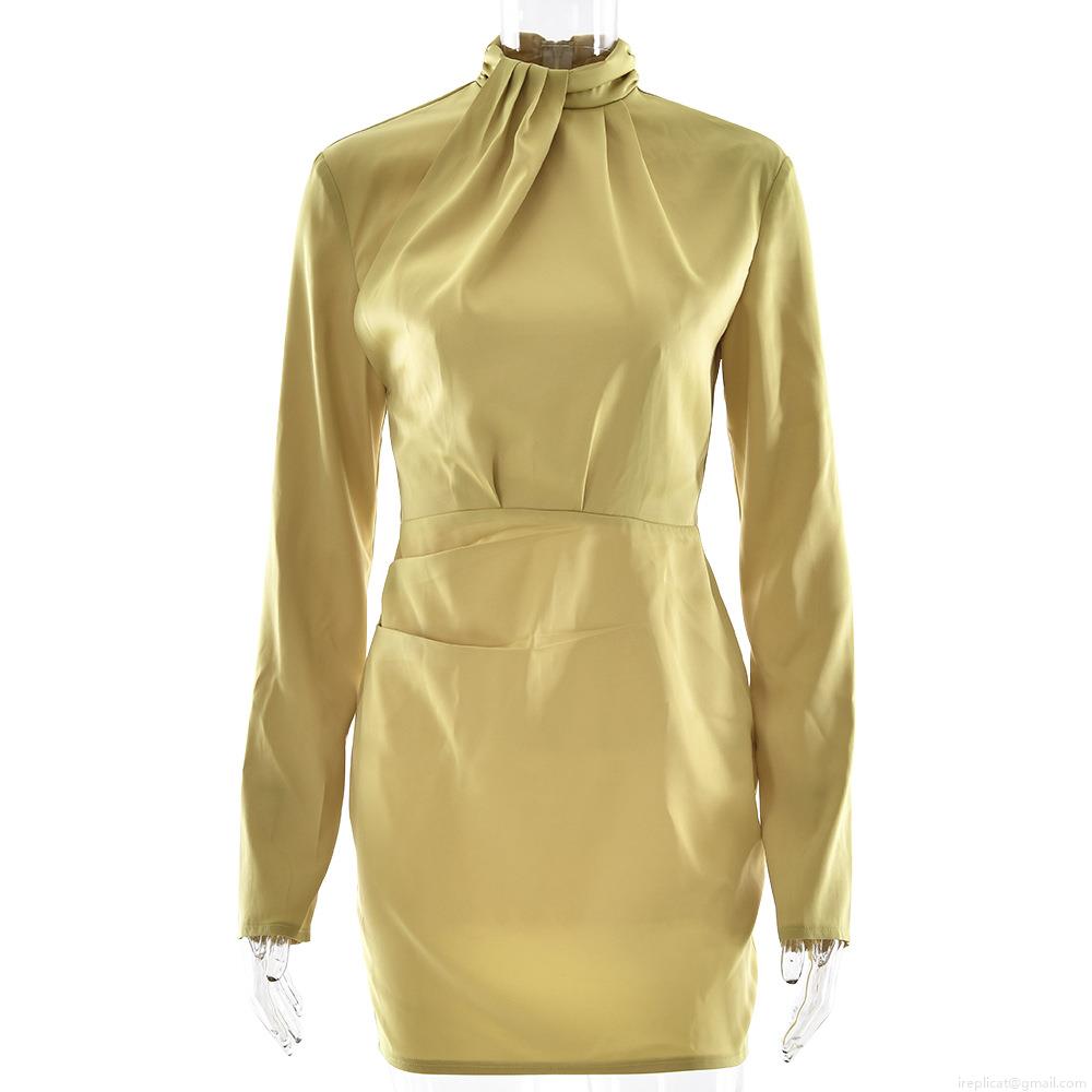 • Women Sexy Golden Satin Mini Dress Mock Neck Long Sleeve Pleated Bodycon Slim Fit Short Gown For Party Club Evening Fashion Hot Girl Dress