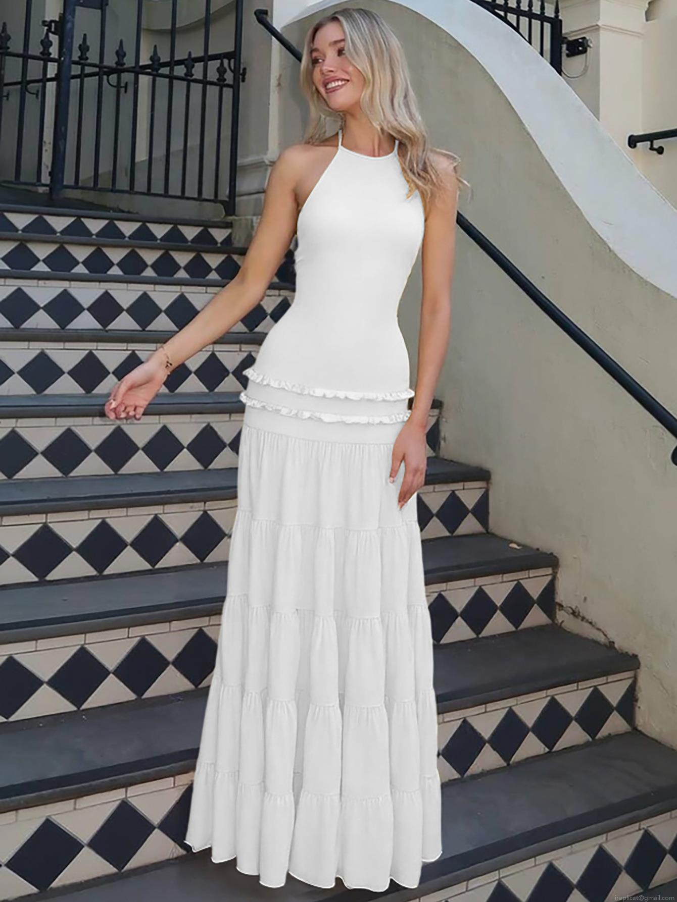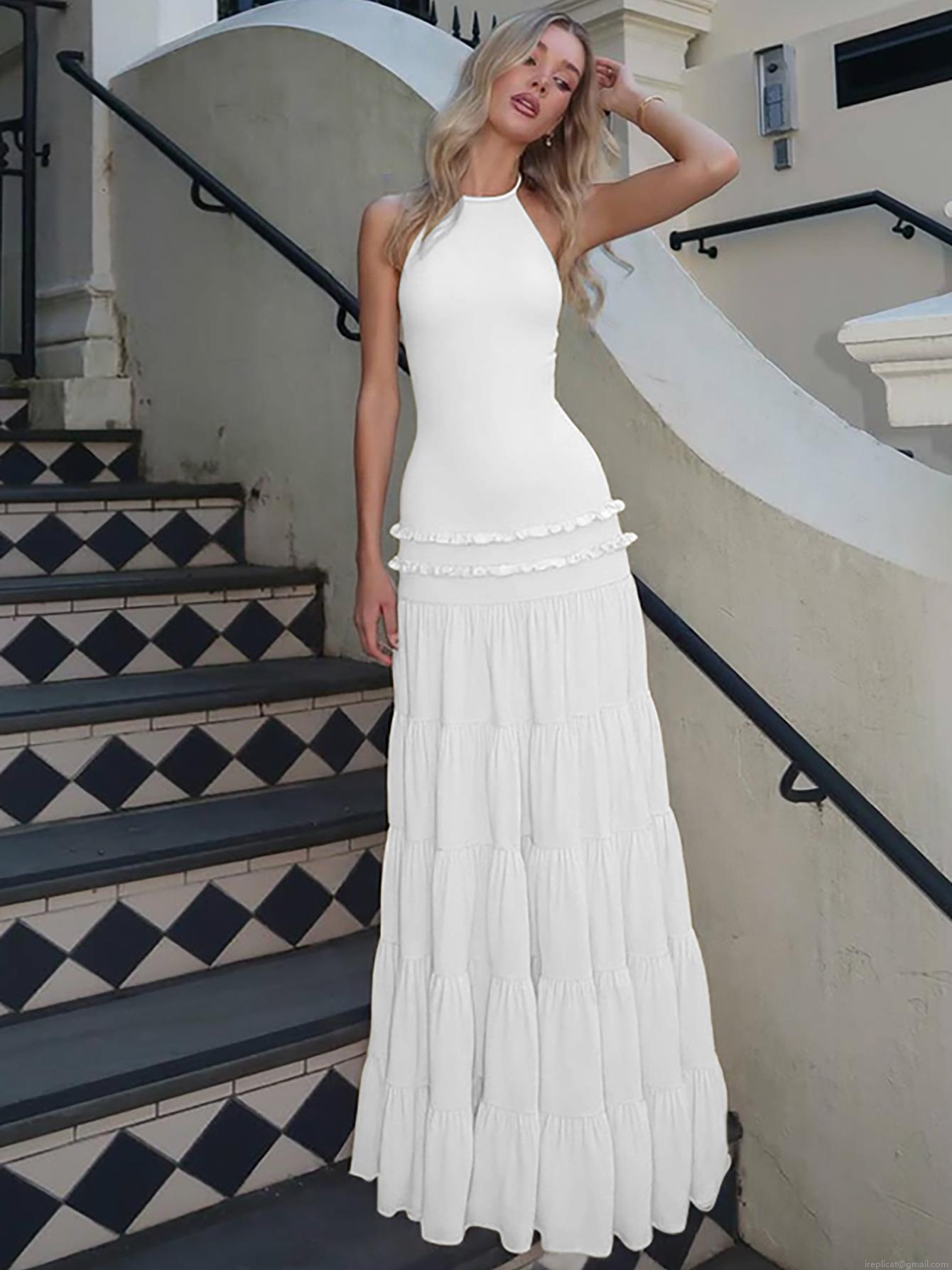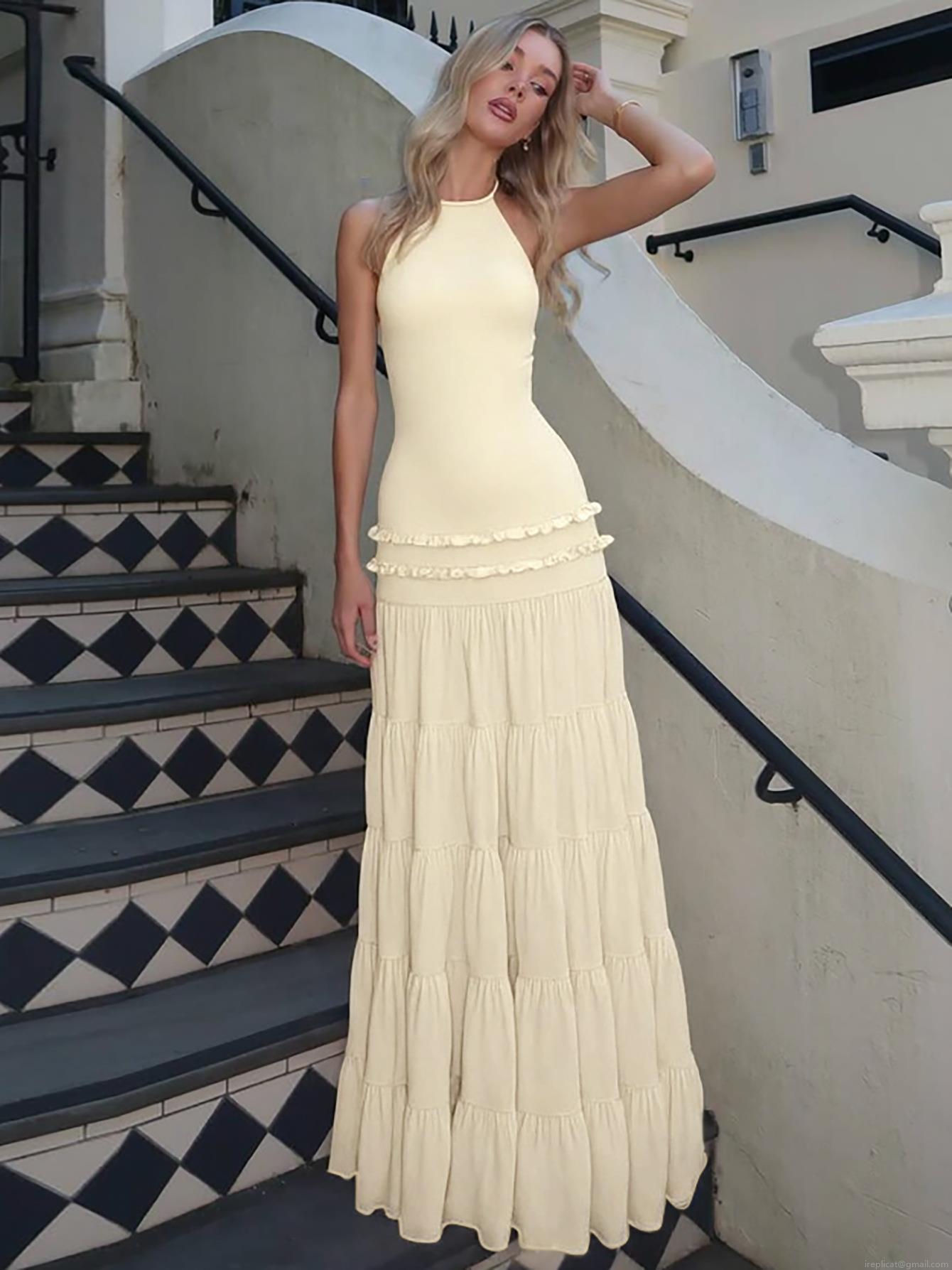 • Women Sexy Halter Backless Maxi Dress 95% Polyester 5% Spandex Tiered Layered Cake Skirt Ruffle Long Dress For Summer Vacation Party Elegant Evening Gown