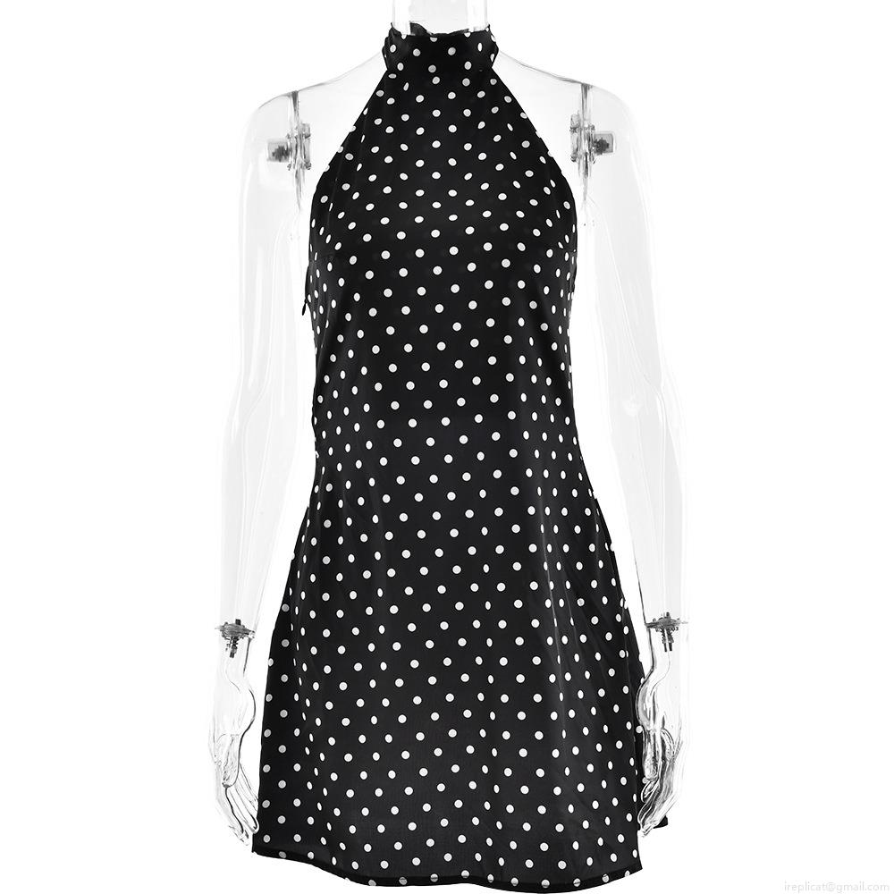 • Women Sexy Halter Backless Polka Dot Satin Mini Dress Slim Fit Sleeveless High Waist Bodycon Summer Fashion Polyester Party Clubwear Dress