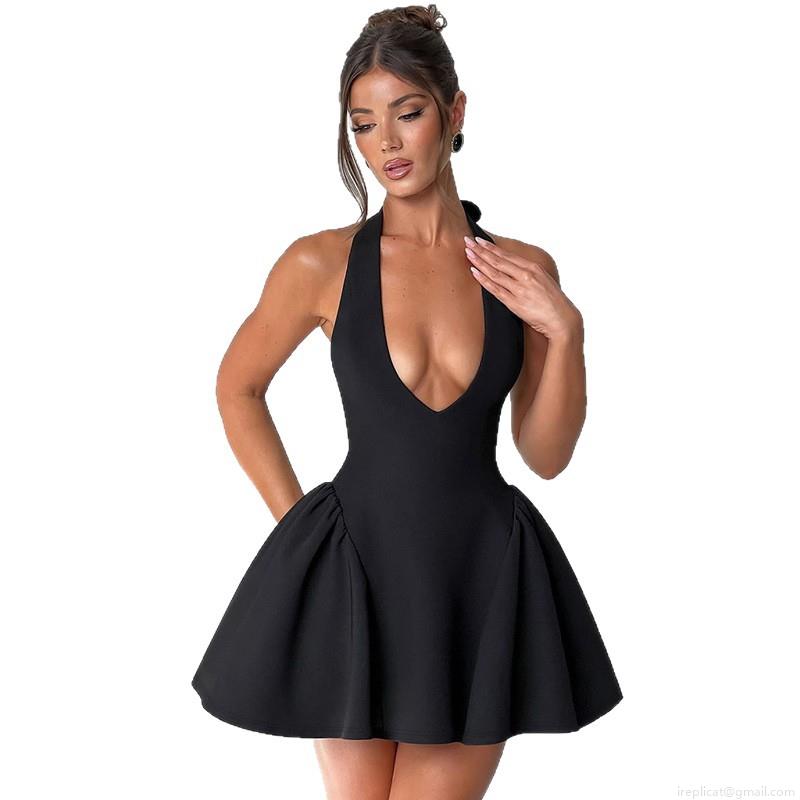Solid Color, Pleats, Neckband, Backless, Tutu, Deep V