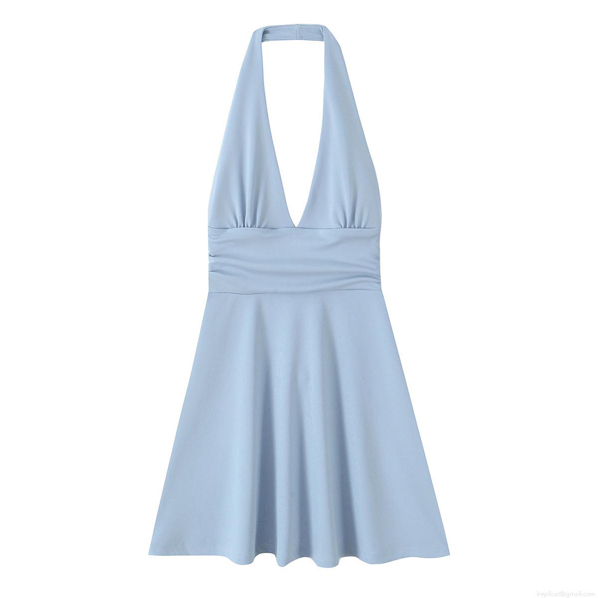 • Women Sexy Halter Deep V Neck Sleeveless Mini Dress Elegant Solid Color Elastic Waist A-Line Skirt Polyester Sun Dress For Vacation Party
