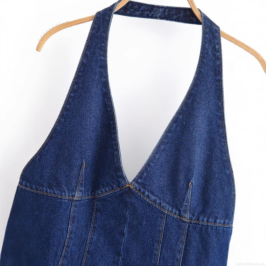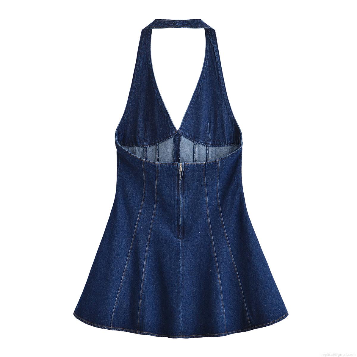 • Women Sexy Halter Denim Dress Deep V-Neck Backless A-Line Mini Blue Cotton Blend Jean Dresses For Women Summer Party Casual Style