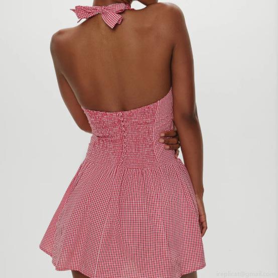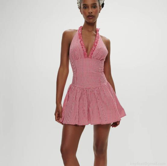 • Women Sexy Halter Neck Deep V Gingham Dress Ruffle Hem Backless Slim Waist A-Line Mini Dress Summer Beach Vacation Checkered Sundress