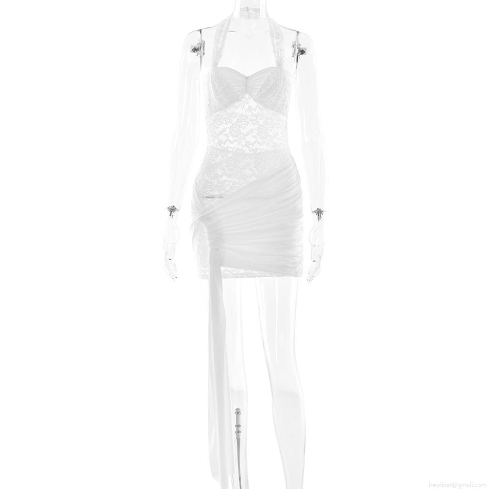 • Women Sexy Halter Neck Lace Patchwork Mini Dress Backless Pleated Sleeveless Streamer Dress Party Clubwear Solid Color Polyester Milk Silk Bodycon