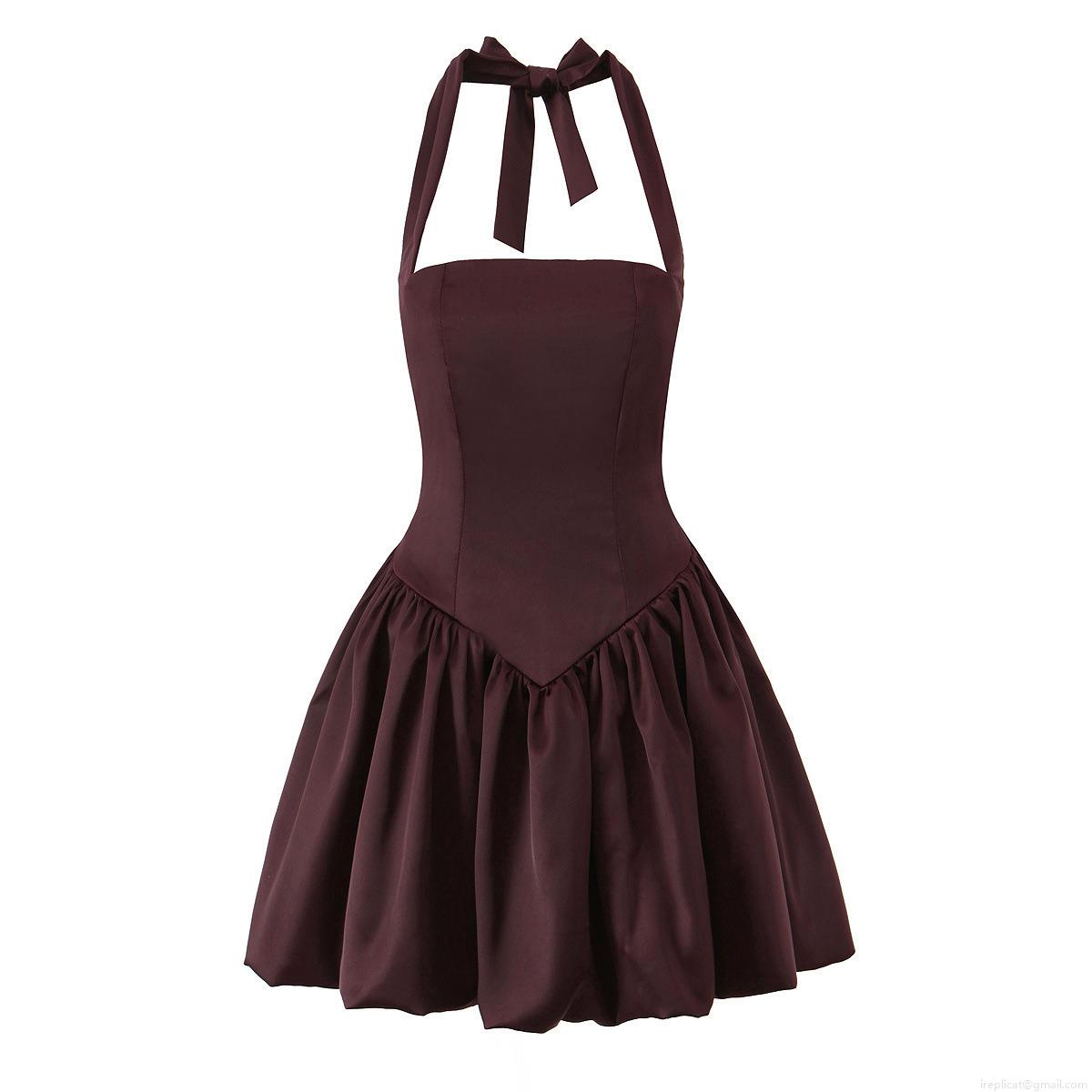• Women Sexy Halter Neck Satin Mini Dress Sleeveless Backless Bow Tie Bubble Hem Puff Party Skirt Elegant Solid Color Polyester Blend Bodycon Short Dress Summer Dating