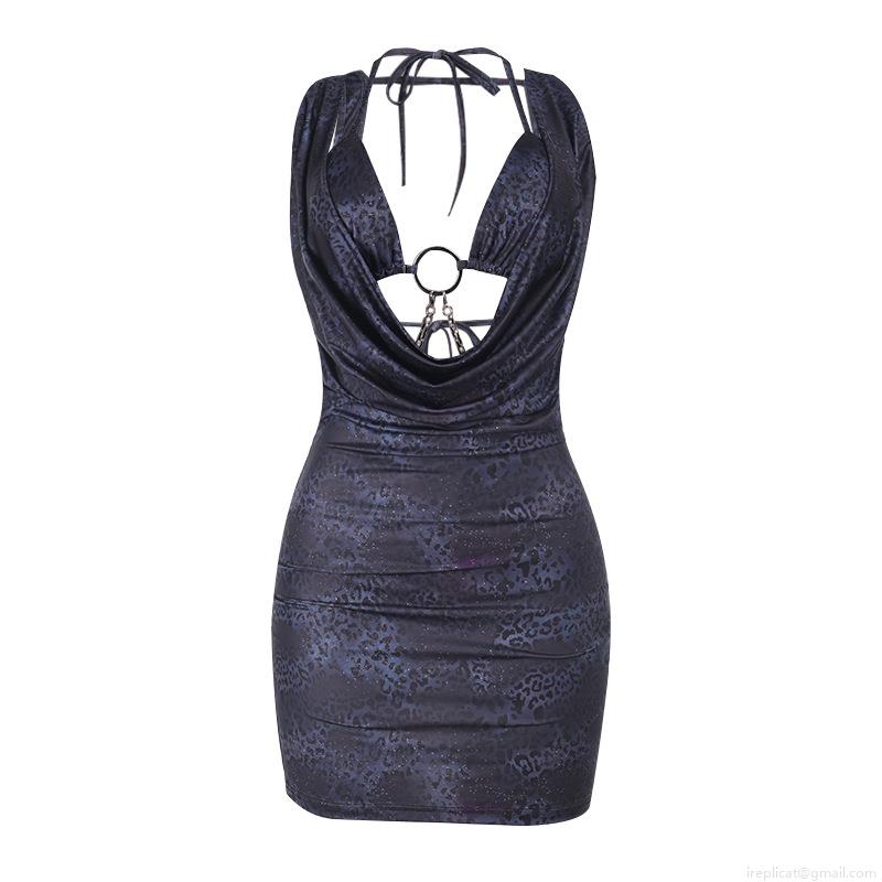 • Women Sexy Halter V-Neck Leopard Print Bodycon Mini Dress With Metal Chain Ring Hollow Out Sleeveless Backless Party Clubwear Outfits
