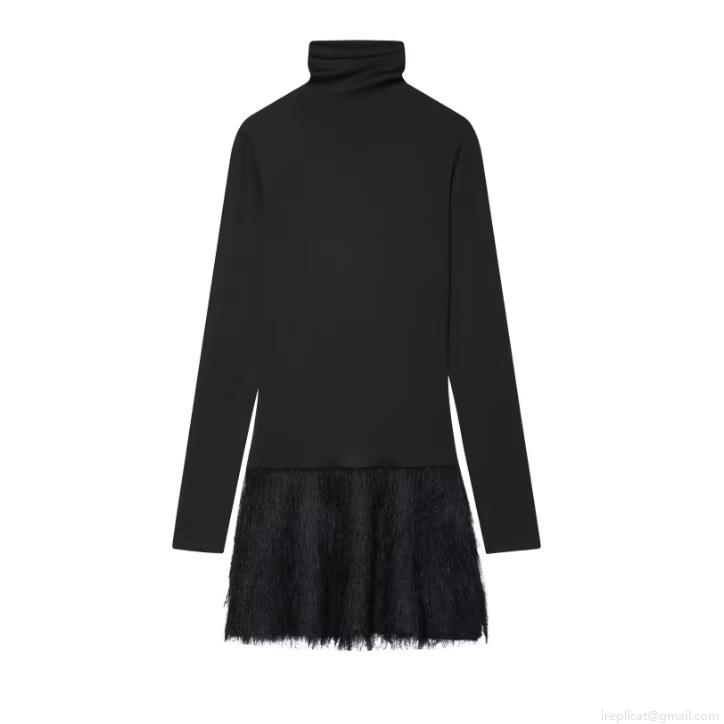 • Women Sexy High Neck Bodycon Mini Dress With Feather Trim Patchwork Long Sleeve Knitted Polyester Celebrity Party Evening Nightclub Dress