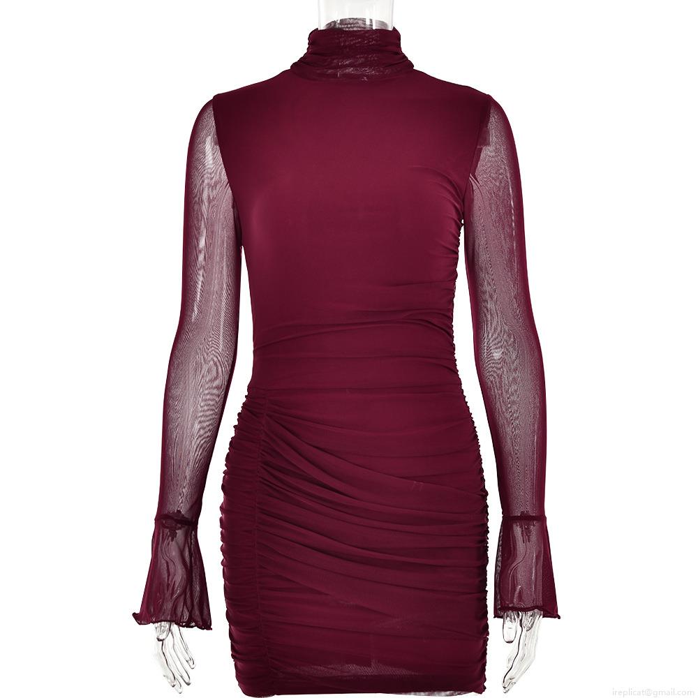 • Women Sexy High Neck Mesh Patchwork Ruched Mini Dress Flare Sleeve Bodycon Polyester Spandex Party Evening Club Dress For Ladies