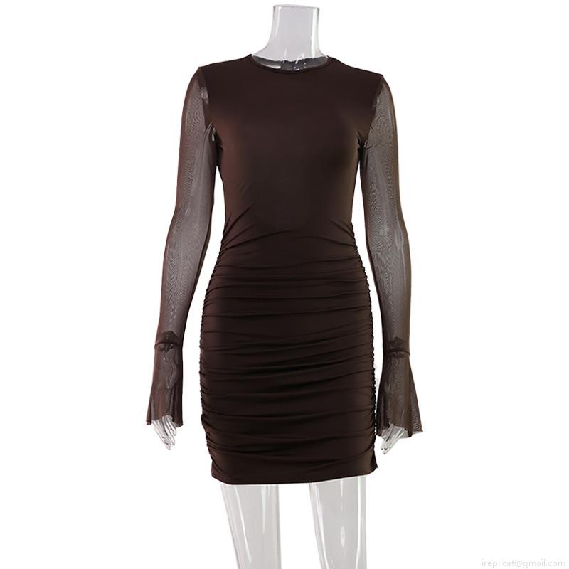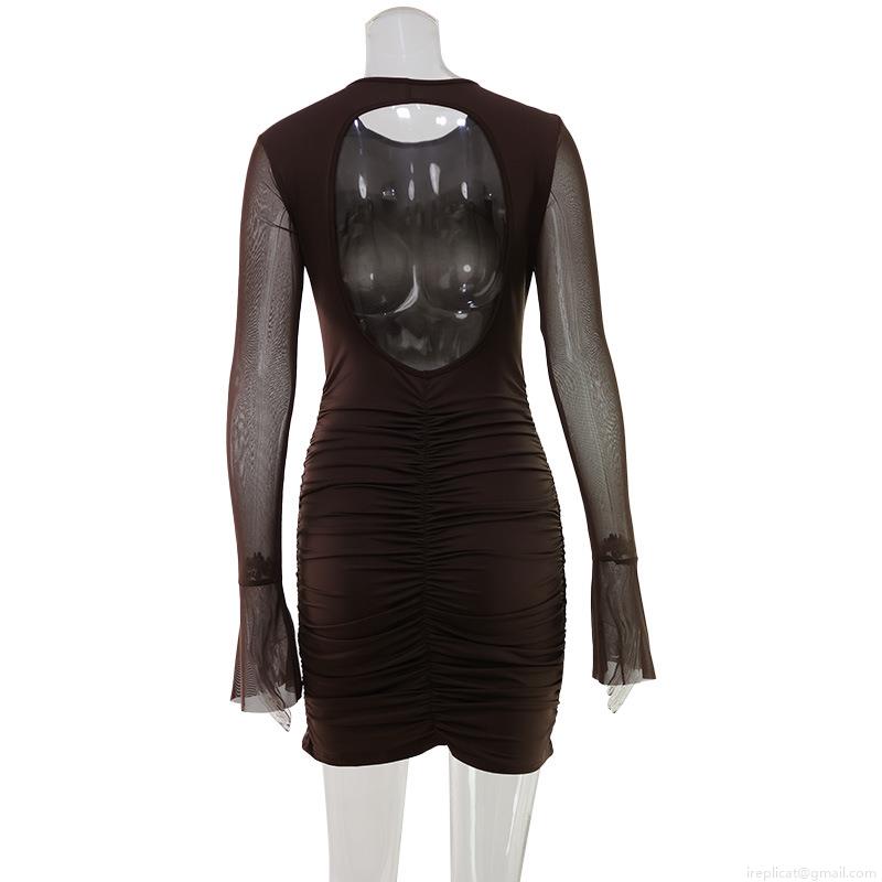 • Women Sexy Hollow Out Backless Mesh Patchwork Bodycon Mini Dress Long Sleeve Ruffle Cuff Ruched Clubwear Brown Party Short Dress For Banquet Dating