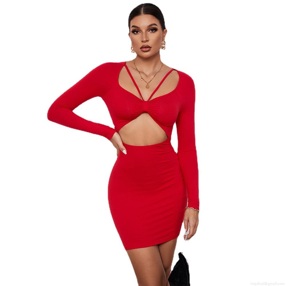 • Women Sexy Hollow Out Bodycon Mini Dress Long Sleeve V Neck Halter Rayon Spandex Knitted Party Club Night Out Y2K Slim Fit Dress