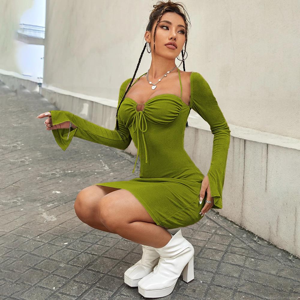 • Women Sexy Hollow Out Drawstring Ruched Mini Dress Backless Slit Long Sleeve Bodycon Party Clubwear Dress
