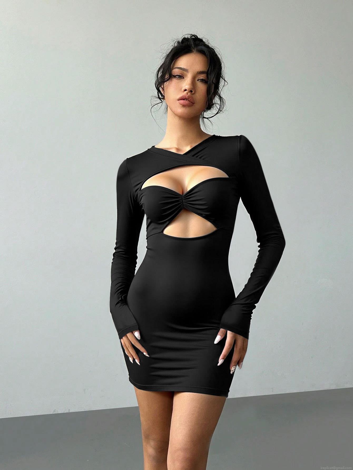 • Women Sexy Hollow Out Long Sleeve Mini Dress Ruched Bodycon Party Dress Y2K Slim Fit Knit Polyester Spandex Clubwear Night Out Black