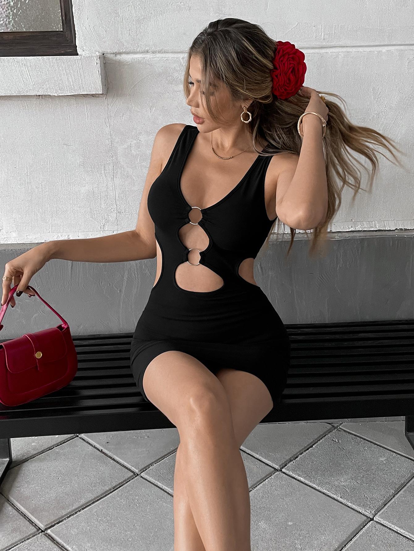 • Women Sexy Hollow Out Mini Bodycon Dress Sleeveless Deep V Neck Knit Polyester Elastane Dress With Metal Ring For Party Clubwear
