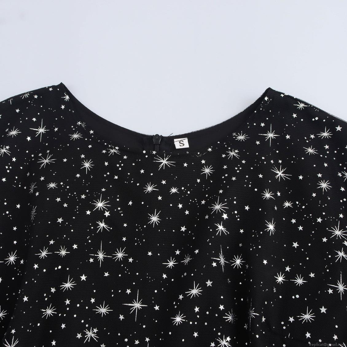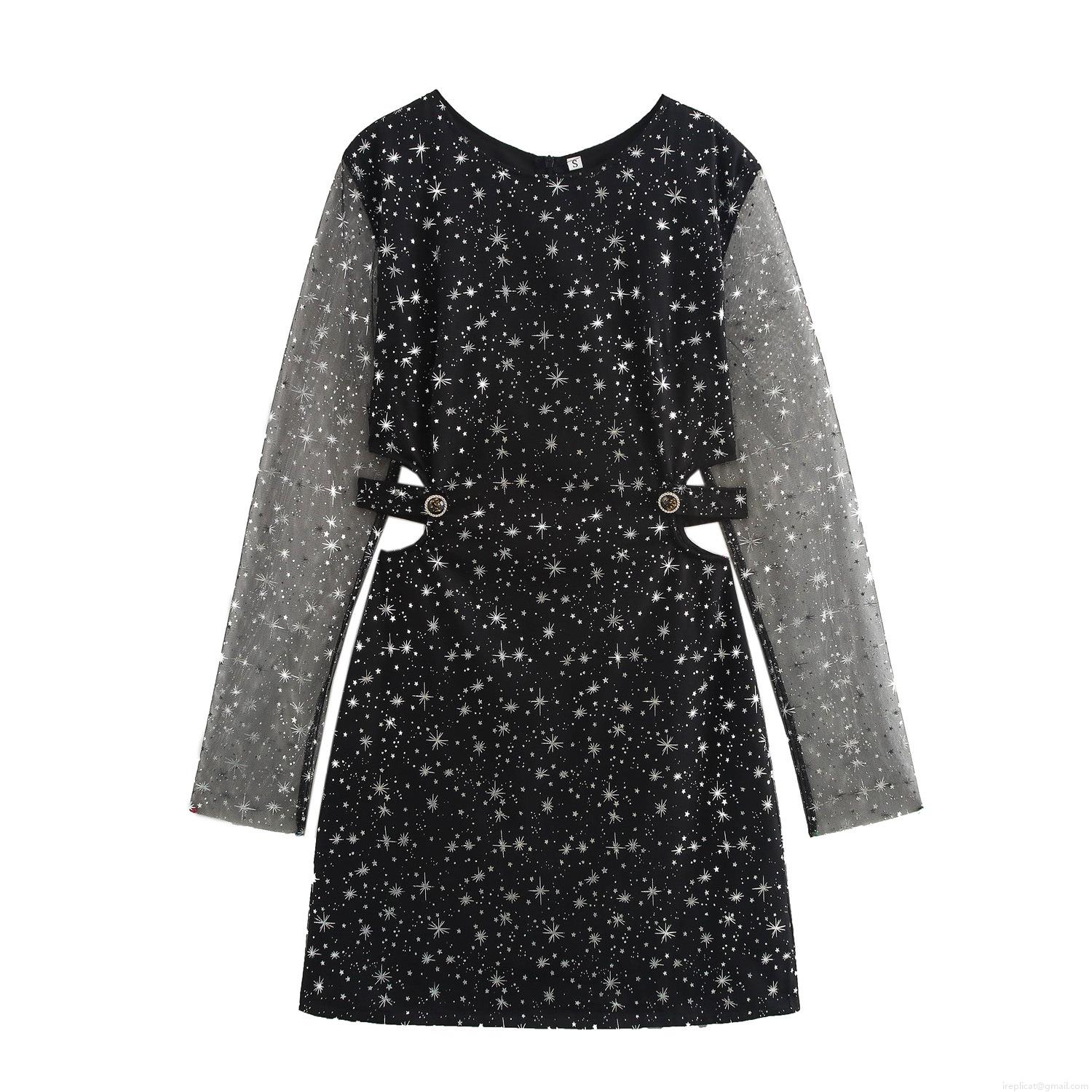• Women Sexy Hollow Out Mini Dress Star Print Mesh Long Sleeve Round Neck Party Nightclub Bodycon Dress Starry Sky A-Line Stamped Dress