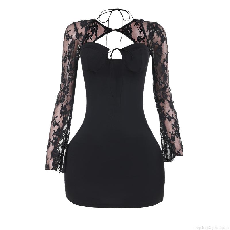 Women Sexy Lace Long Sleeve Bodycon Mini Dress Backless Criss Cross Tie Up Halter Neck Slim Fit Party Night Club Evening Dress