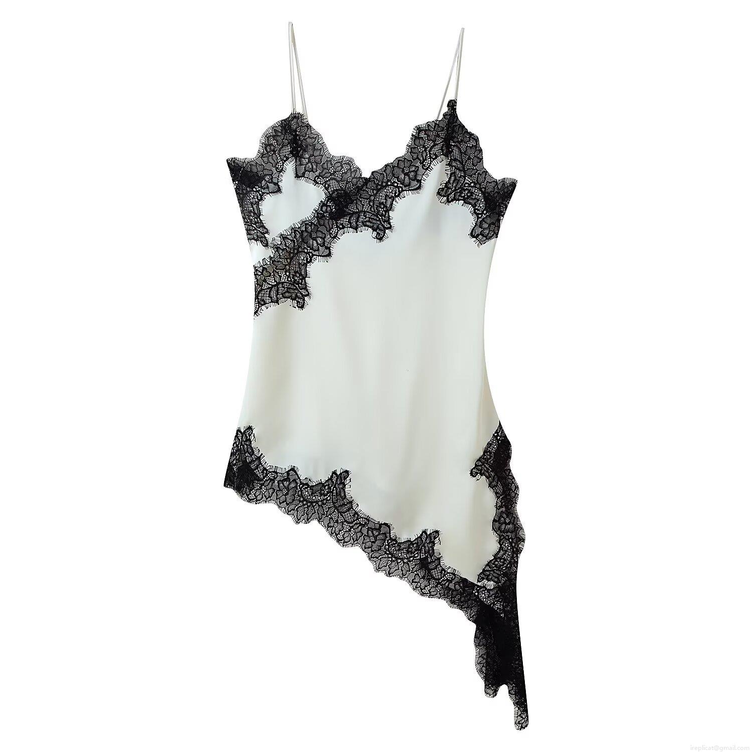 Solid Color, Color Blocking, Lace Patchwork, Deep V-neck, Thin Straps, Asymmetrical Hem