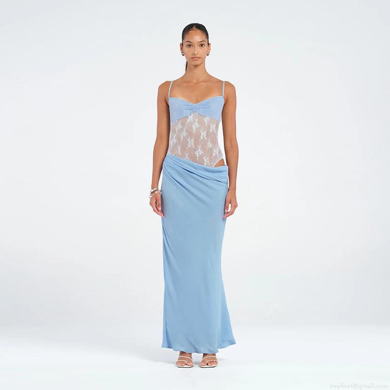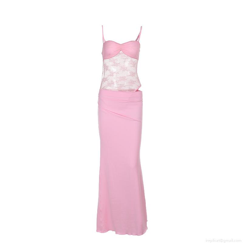 Women Sexy Lace Stitching Sling Maxi Dress High Waist Hollow Out Bodycon Long Dress Pink Light Blue Summer Vacation Party Clubwear Dresses
