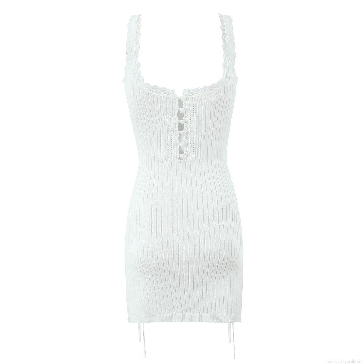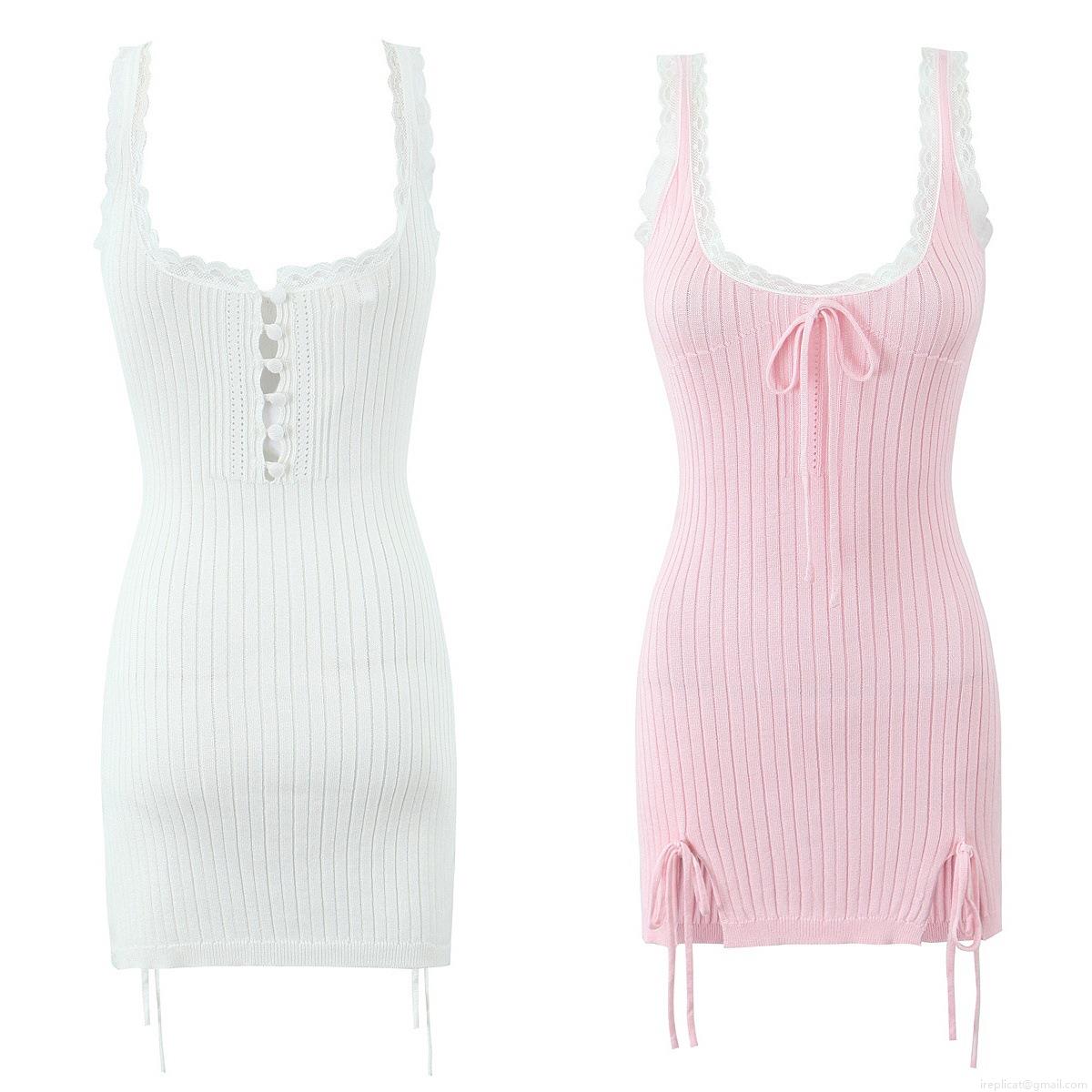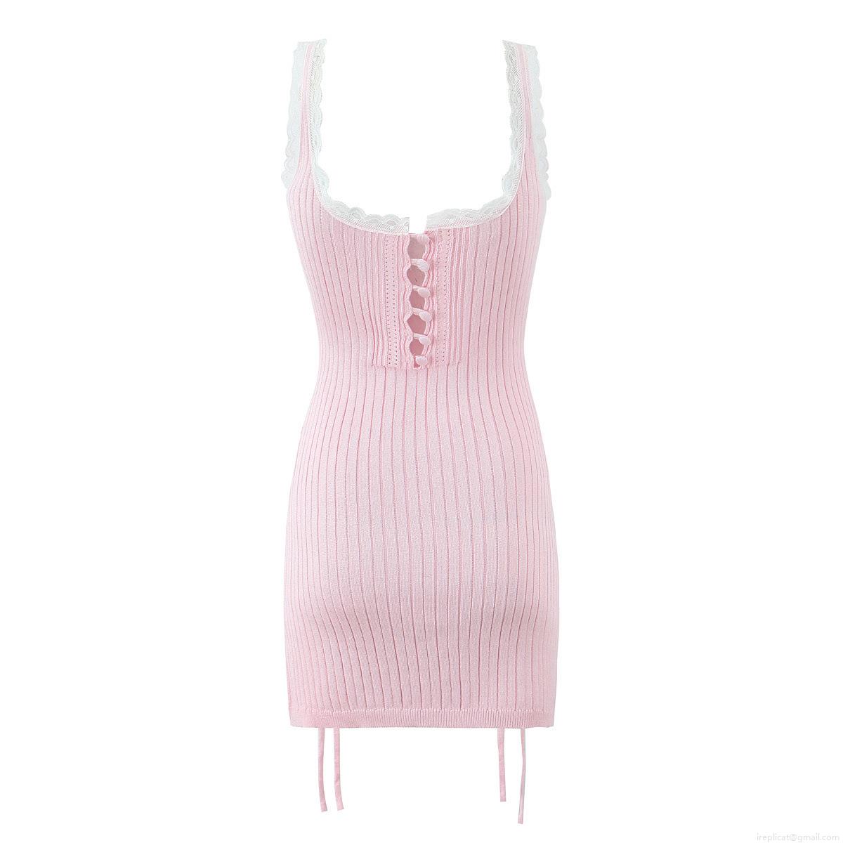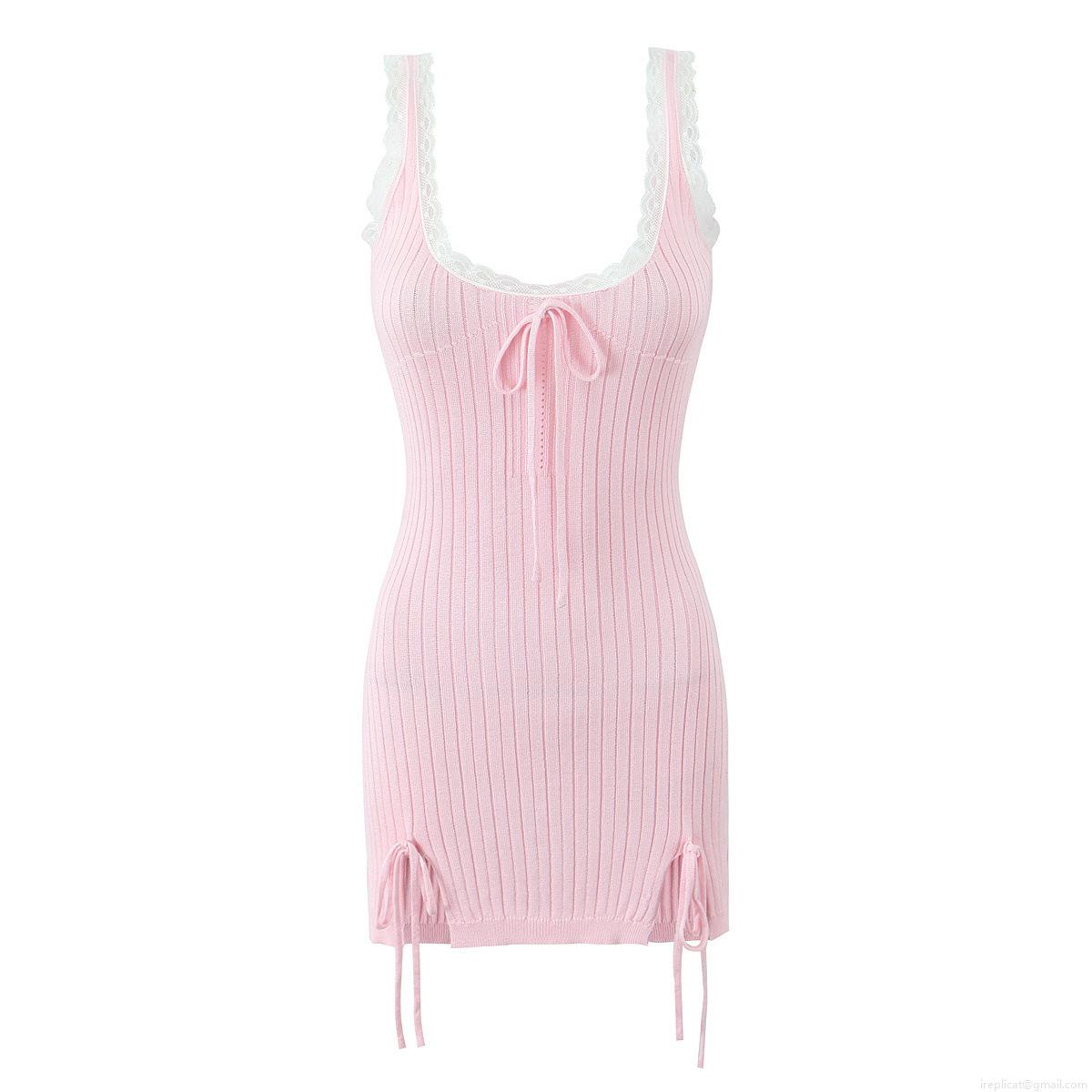 • Women Sexy Lace Trim Knitted Cami Mini Dress Ribbed Polyester Lace-up A-Line Short Dress Pink White Bodycon Clubwear Party Dresses For Ladies
