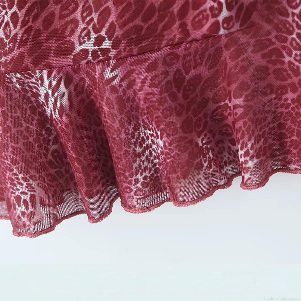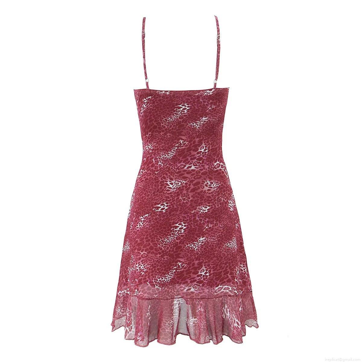 • Women Sexy Leopard Print Cami Mini Dress Wine Red Polyester Spandex V-Neck Backless Ruffle Hem Bodycon Summer Dress For Party Clubwear Streetwear