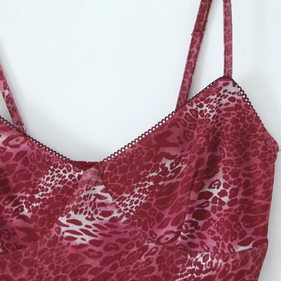 Women Sexy Leopard Print Cami Mini Dress Wine Red Polyester Spandex V-Neck Backless Ruffle Hem Bodycon Summer Dress For Party Clubwear Streetwear