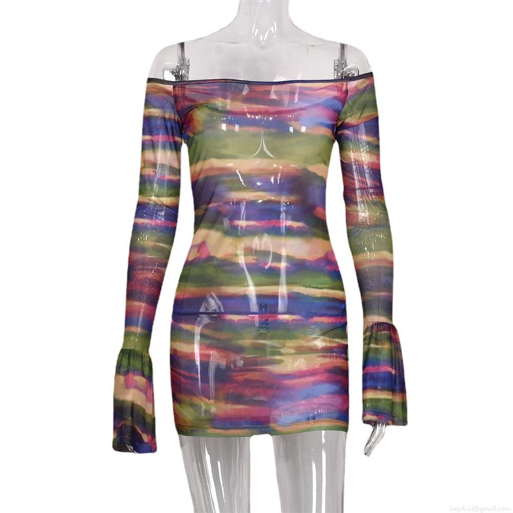 Women Sexy Mesh See Through Bodycon Mini Dress Off Shoulder Flare Long Sleeve Multicolour Tie Dye Striped Party Night Club Fashion Outfits