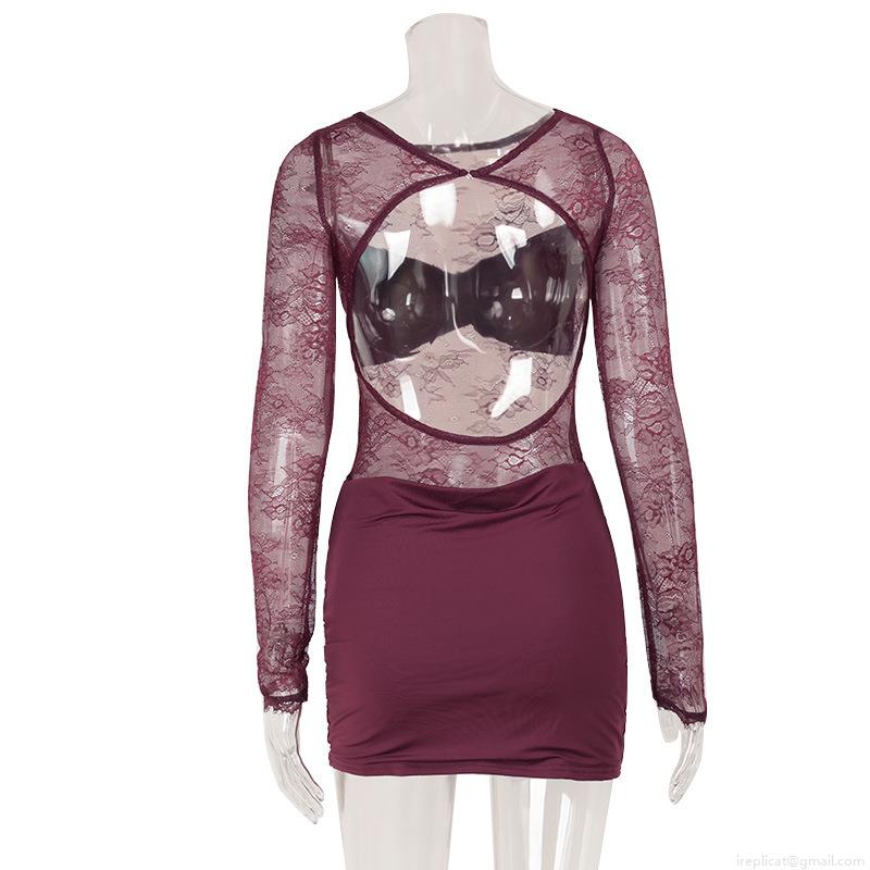 Women Sexy Nightclub Lace Stitching Long Sleeve Bodycon Mini Dress Sheer Patchwork Ruched Backless Party Clubwear Solid Color Hot Girl Slim Fit Burgundy Purple Dresses