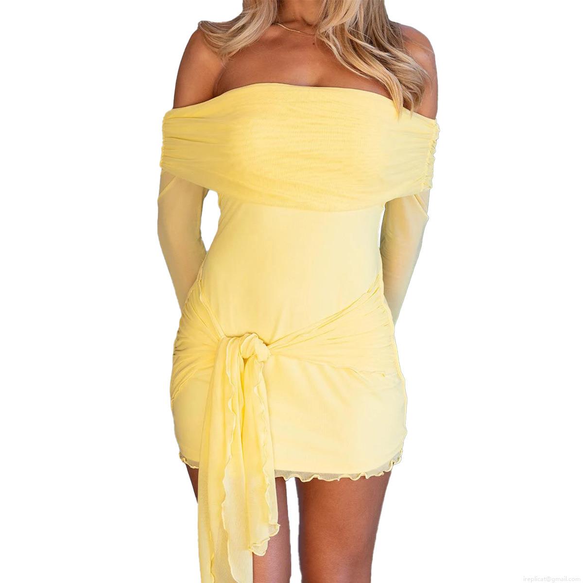 • Women Sexy Off Shoulder Long Sleeve Ruched Mini Dress With Tie Waist Mesh Stitching Elegant Bodycon Party Club Night Dress For Ladies