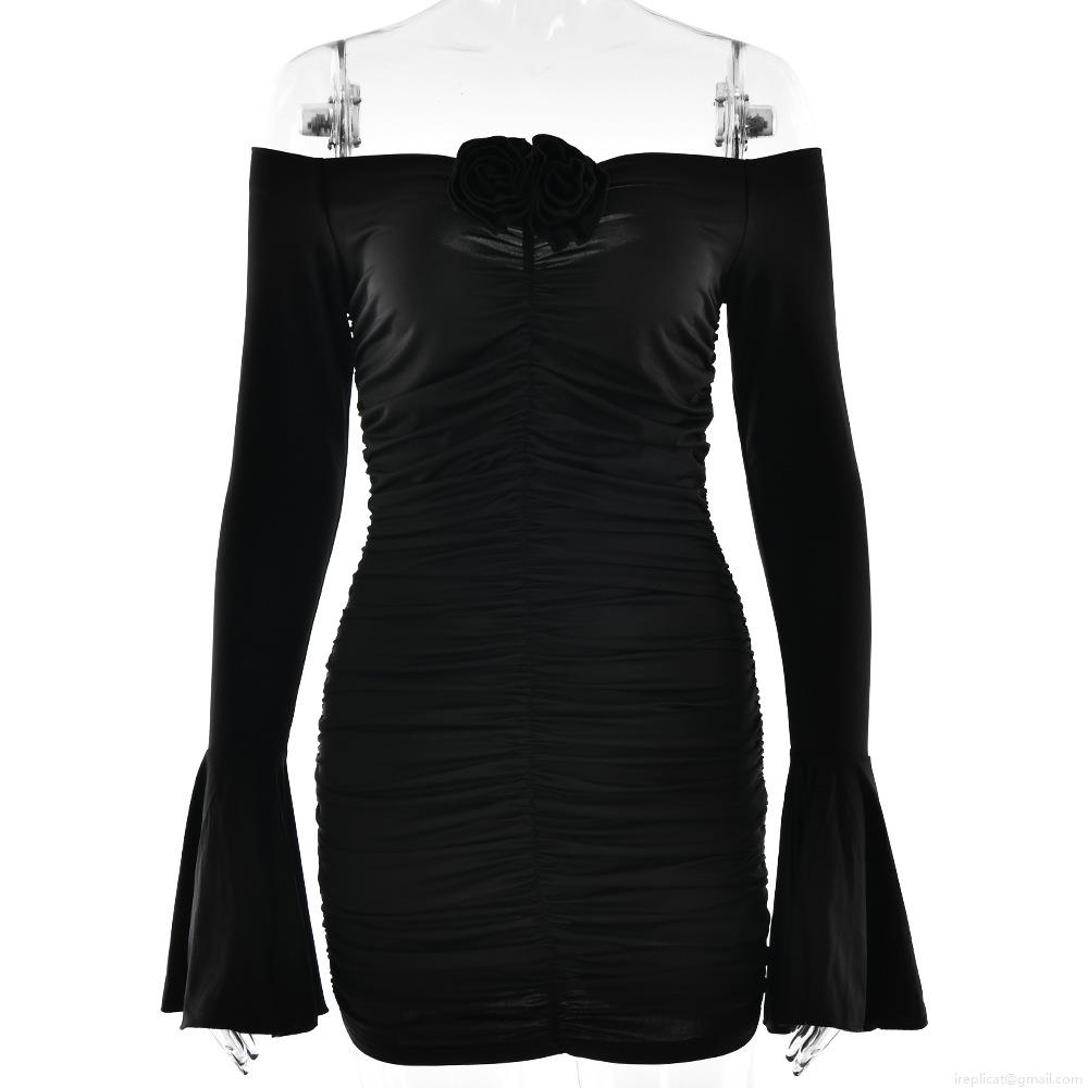 • Women Sexy Off Shoulder Ruched Bodycon Mini Dress Long Flared Sleeve 3D Flower Decor Polyester Slim Fit Party Clubwear Nightout Dress