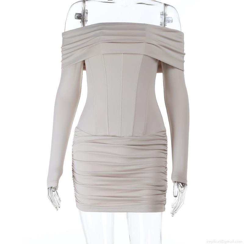 • Women Sexy Off Shoulder Ruched Mini Dress With Long Sleeves High Waist Fishbone Corset Slim Fit Bodycon Dress For Party Club Night Out Fall