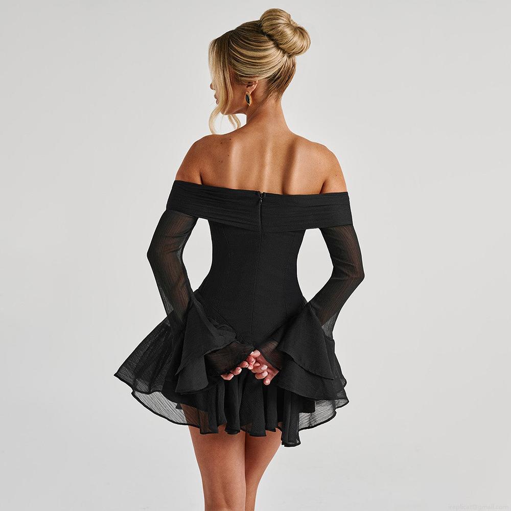 Women Sexy Off-the-Shoulder Flare Sleeve Dress Polyester Cotton Blend High Waist A-Line Mini Dress With Bowknot Decor For Party Club Streetwear