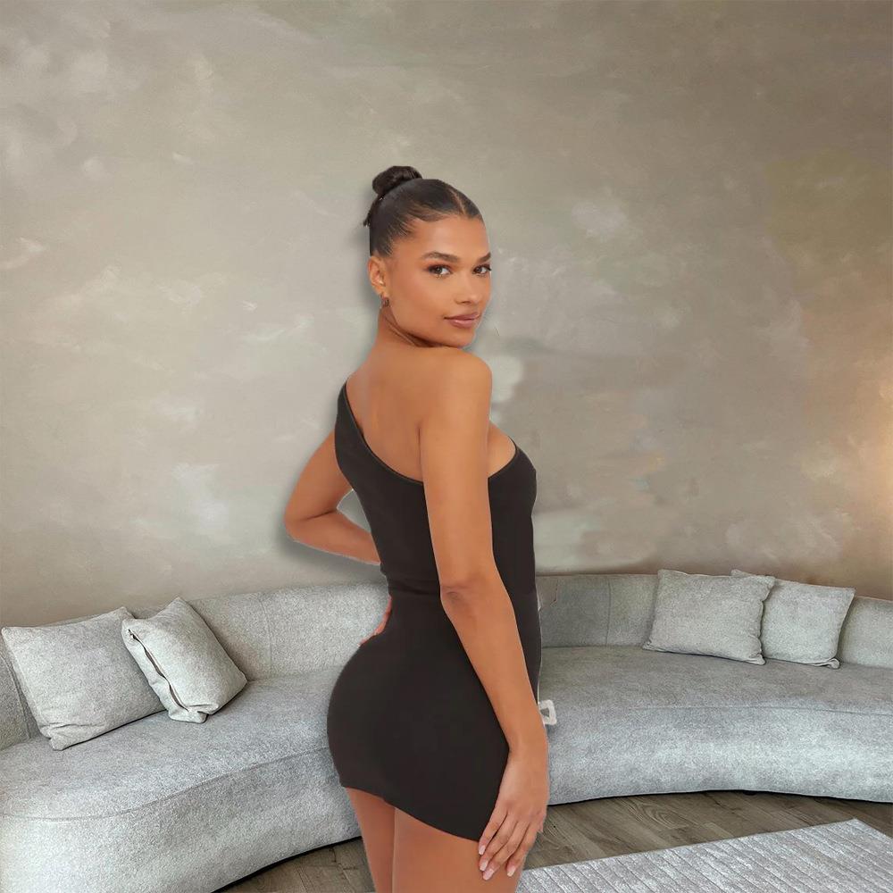 • Women Sexy One Shoulder Rhinestone Bow Black Mini Dress Asymmetric Neckline Side Slit Slim Fit Roma Fabric Party Nightclub Dress