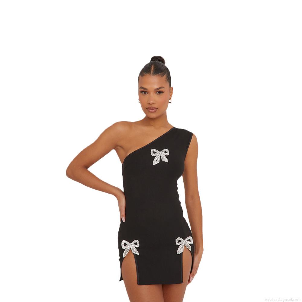 Women Sexy One Shoulder Rhinestone Bow Black Mini Dress Asymmetric Neckline Side Slit Slim Fit Roma Fabric Party Nightclub Dress