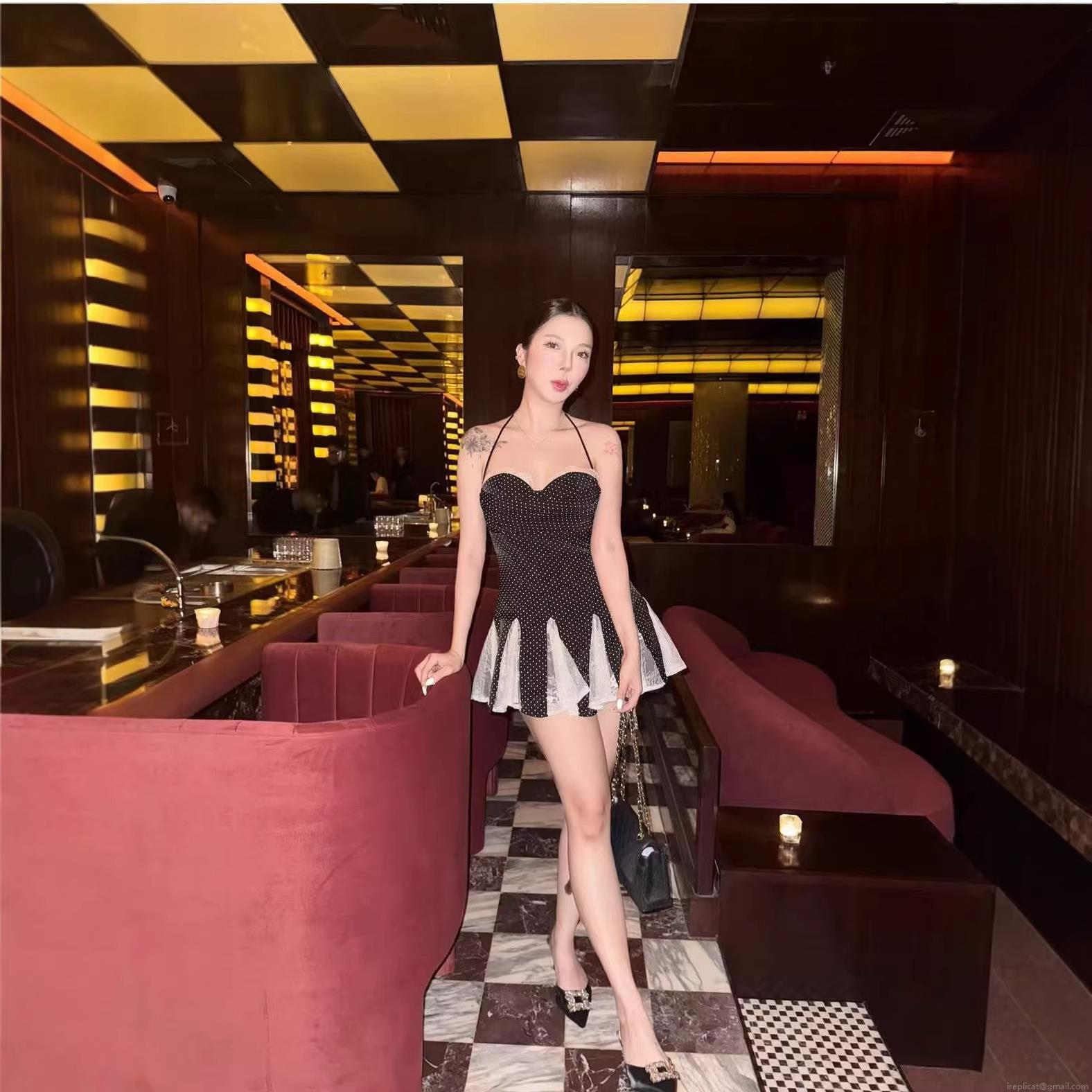 • Women Sexy Polka Dot Halter Neck Mini Dress Vintage Lace Patchwork Slim Fit Pleated Backless Summer Party A-Line Dress