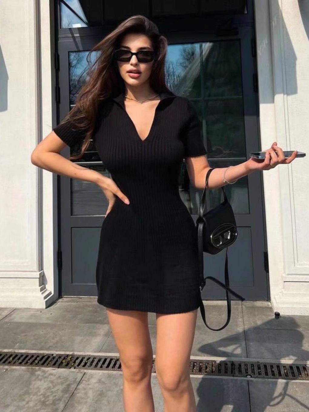 • Women Sexy Polo V-Neck Ribbed Knit Mini Dress Short Sleeve Slim Fit A-Line Solid Color Summer Casual Streetwear Bodycon Short Dress