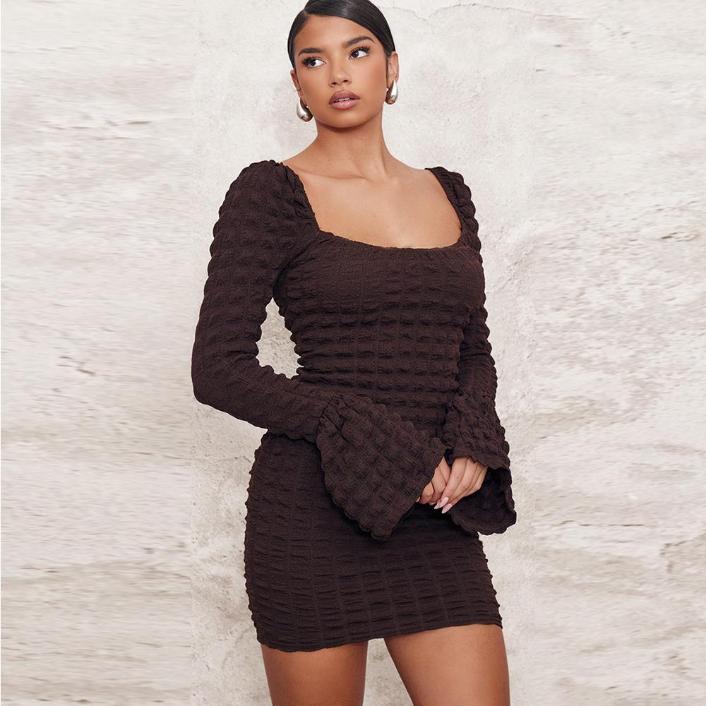 Women Sexy Popcorn Fabric Square Neck Mini Dress Long Flare Sleeve Hollow Out Solid Color Bodycon Streetwear Party Clubwear Short Dress