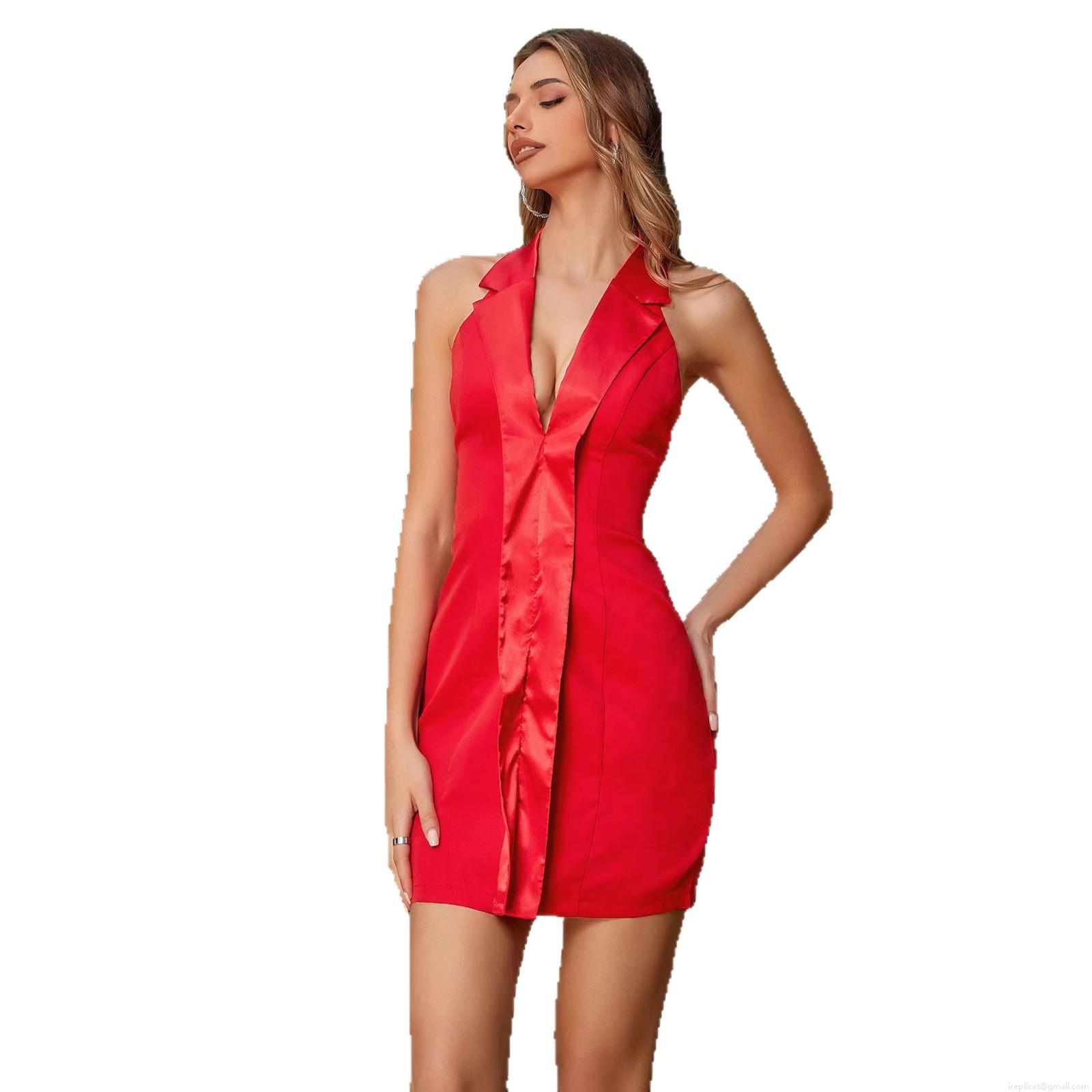 • Women Sexy Red Halter Backless Mini Dress Satin Polyester Spandex Deep V Neck Lapel Bodycon Slim Fit Party Club Cocktail Summer Streetwear Short Dress