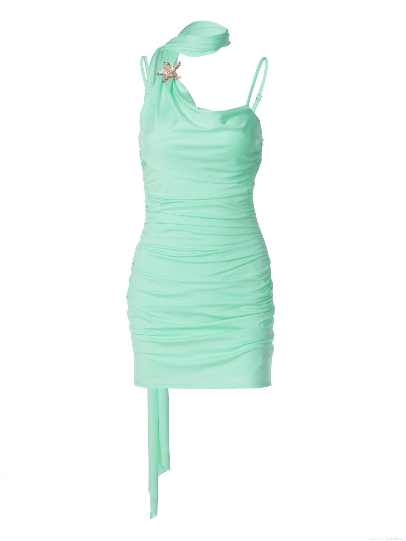 Women Sexy Ruched Bodycon Mini Dress Asymmetric Halter Sleeveless Polyester Spandex Solid Party Club Dress With Star Brooch