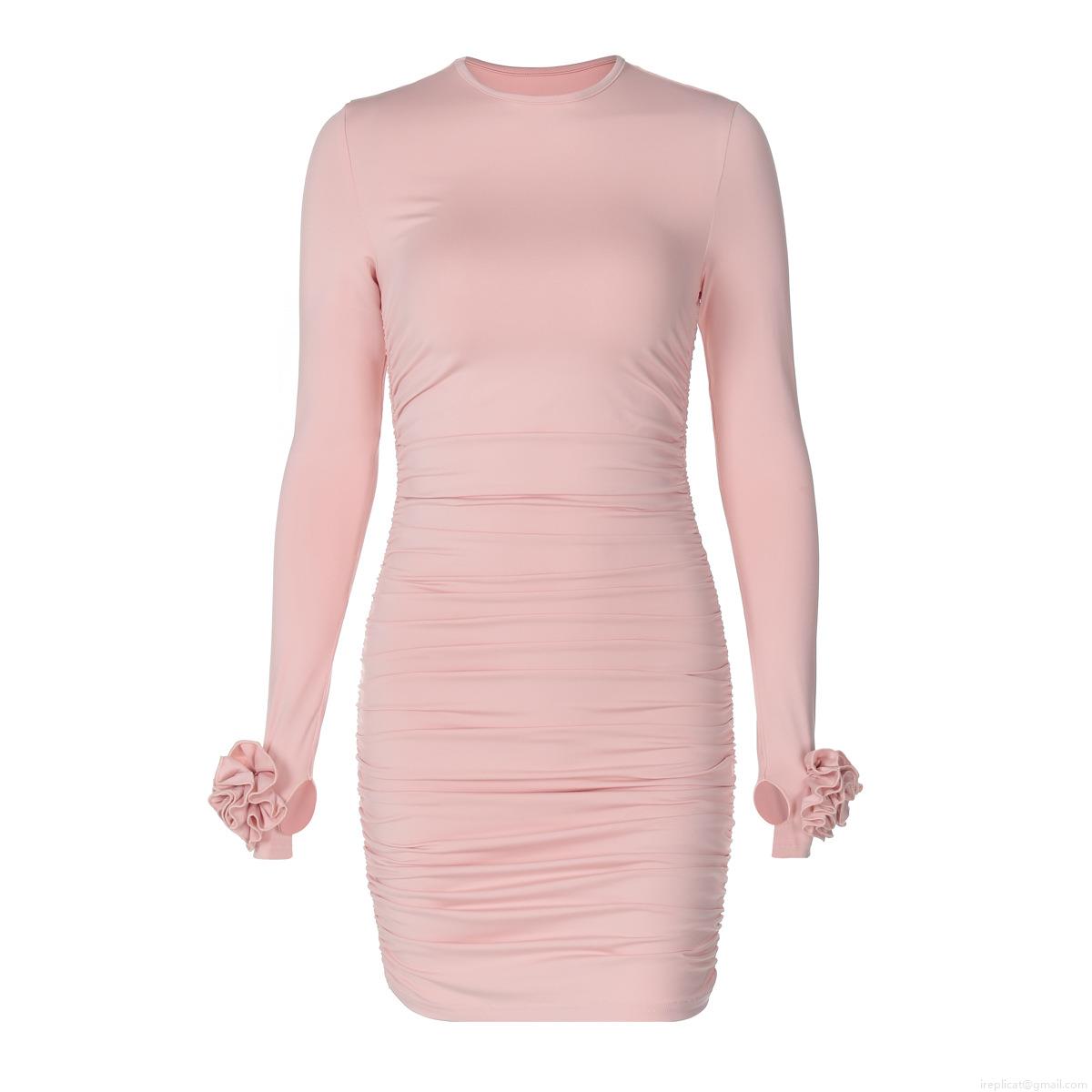 • Women Sexy Ruched Bodycon Mini Dress Long Sleeve With 3D Floral Decoration Cuffs Round Neck Solid Color Polyester Spandex Slim Fit Party Club Evening Dress For Women
