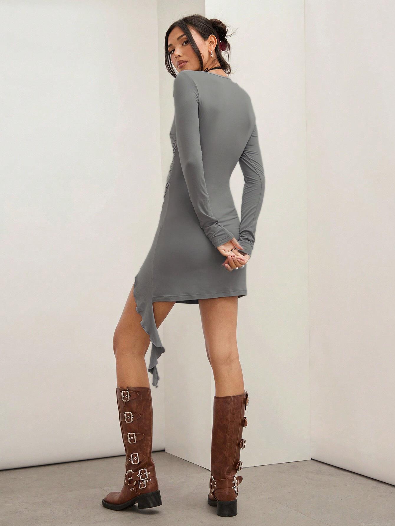 • Women Sexy Ruched Bodycon Mini Dress Long Sleeve Wrap V Neck Side Slit High Waist Slim Fit Polyester Elastane Knit Club Party Streetwear Short Dress Grey