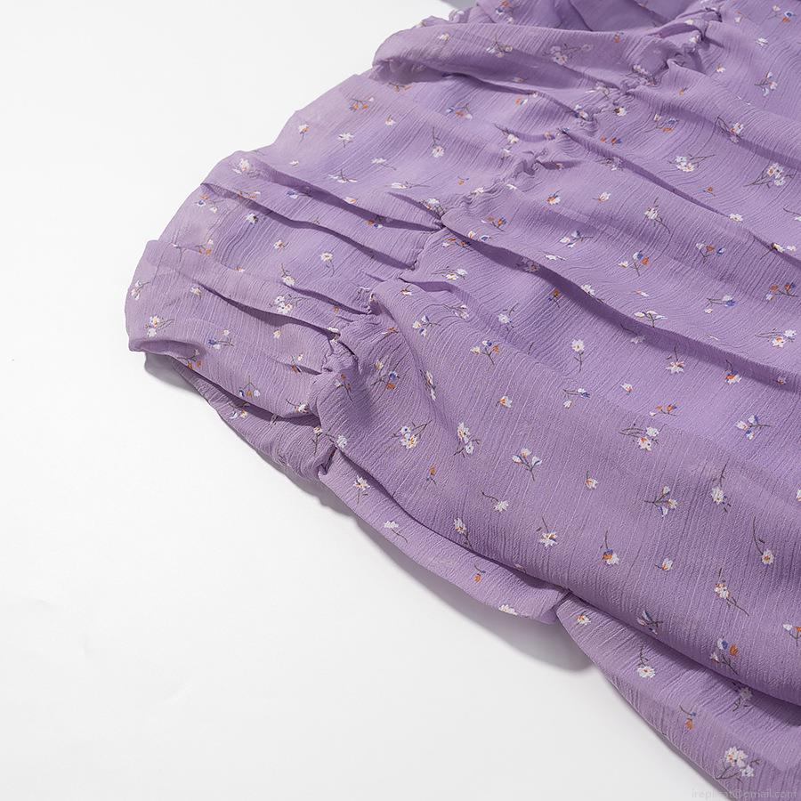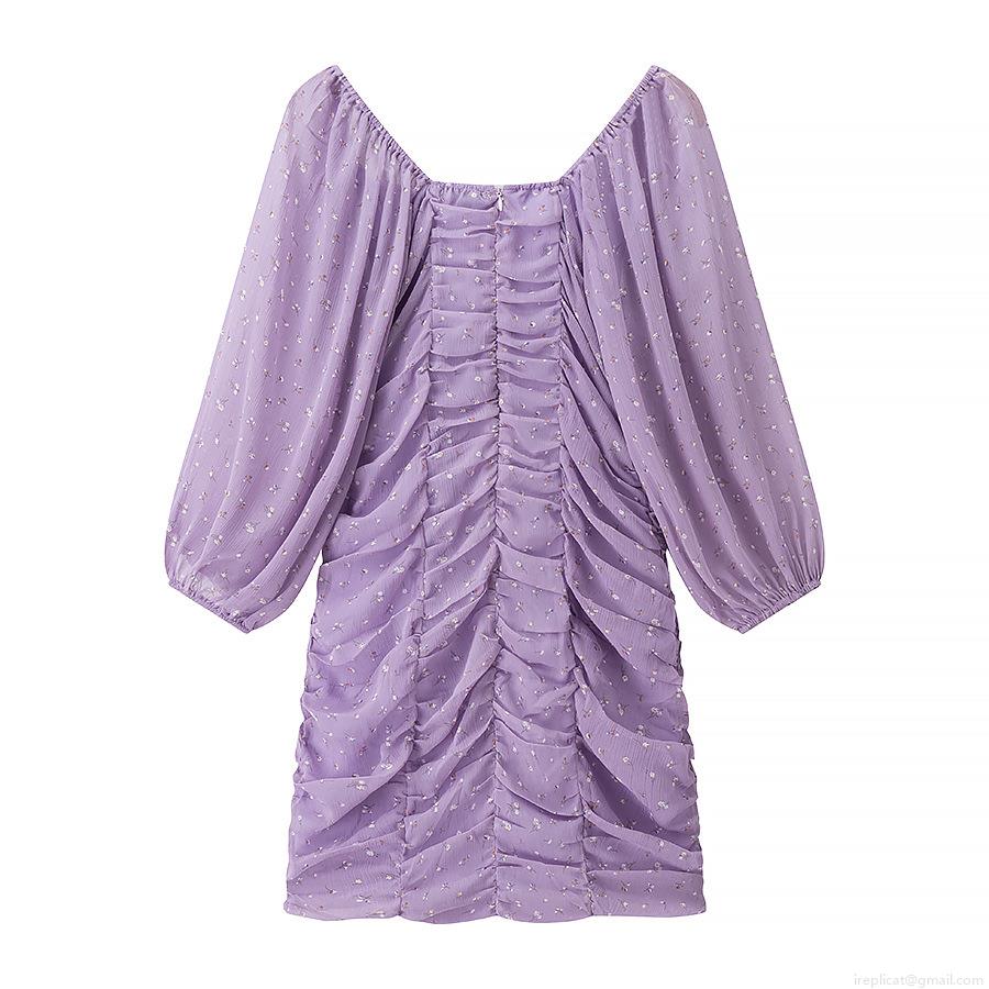 Women Sexy Ruched Floral Mini Dress Square Neck Puff Long Sleeve Bodycon Party Club Evening Dress Elegant French Style Slim Fit Purple Short Dress