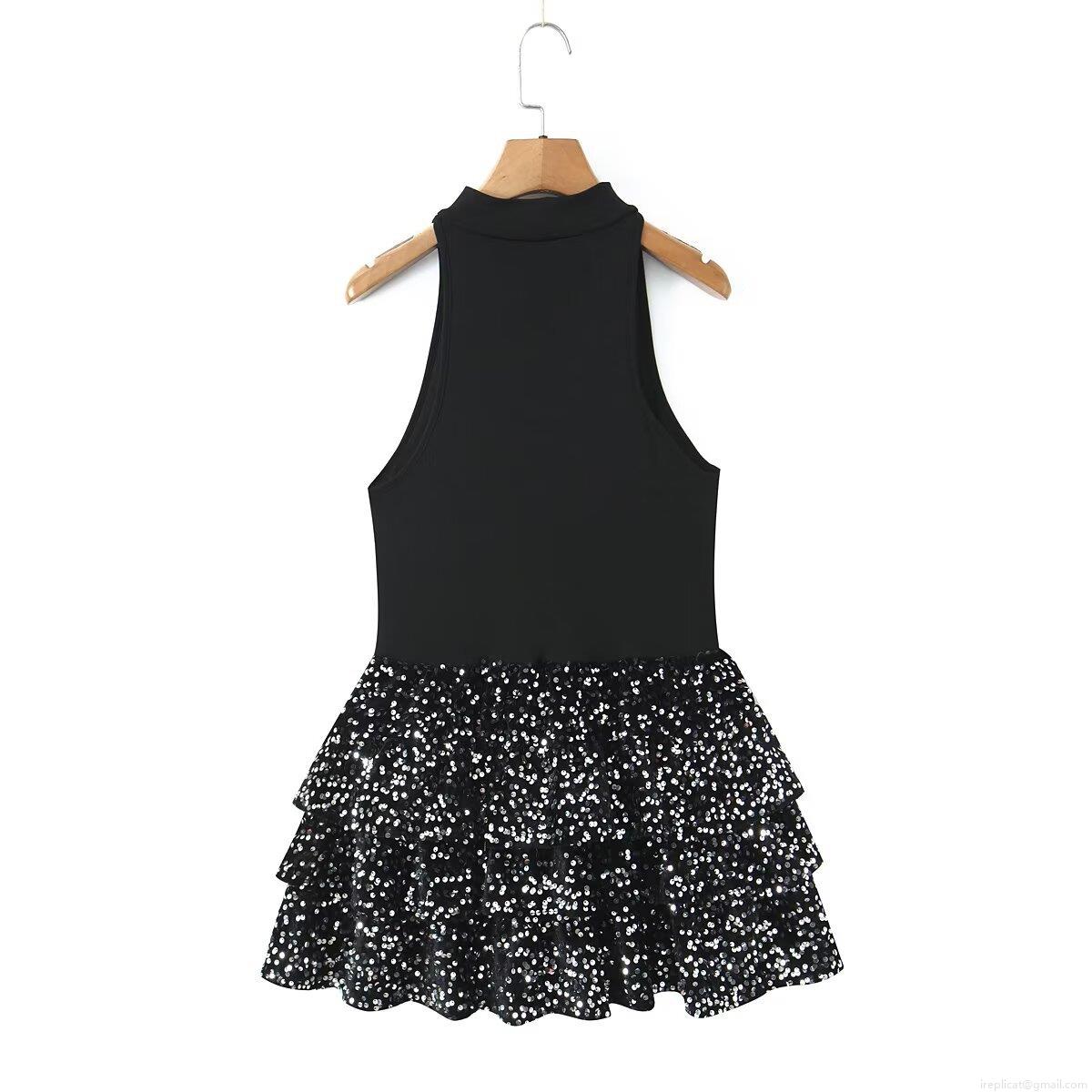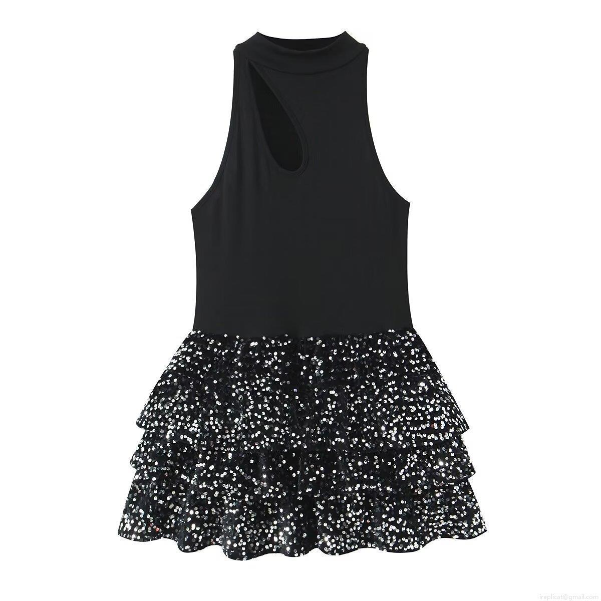 • Women Sexy Sequin Patchwork Mini Dress Sleeveless Cutout Halter Neck Tiered Cake Dress For Party Night Out Club Cocktail Evening Slim Fit