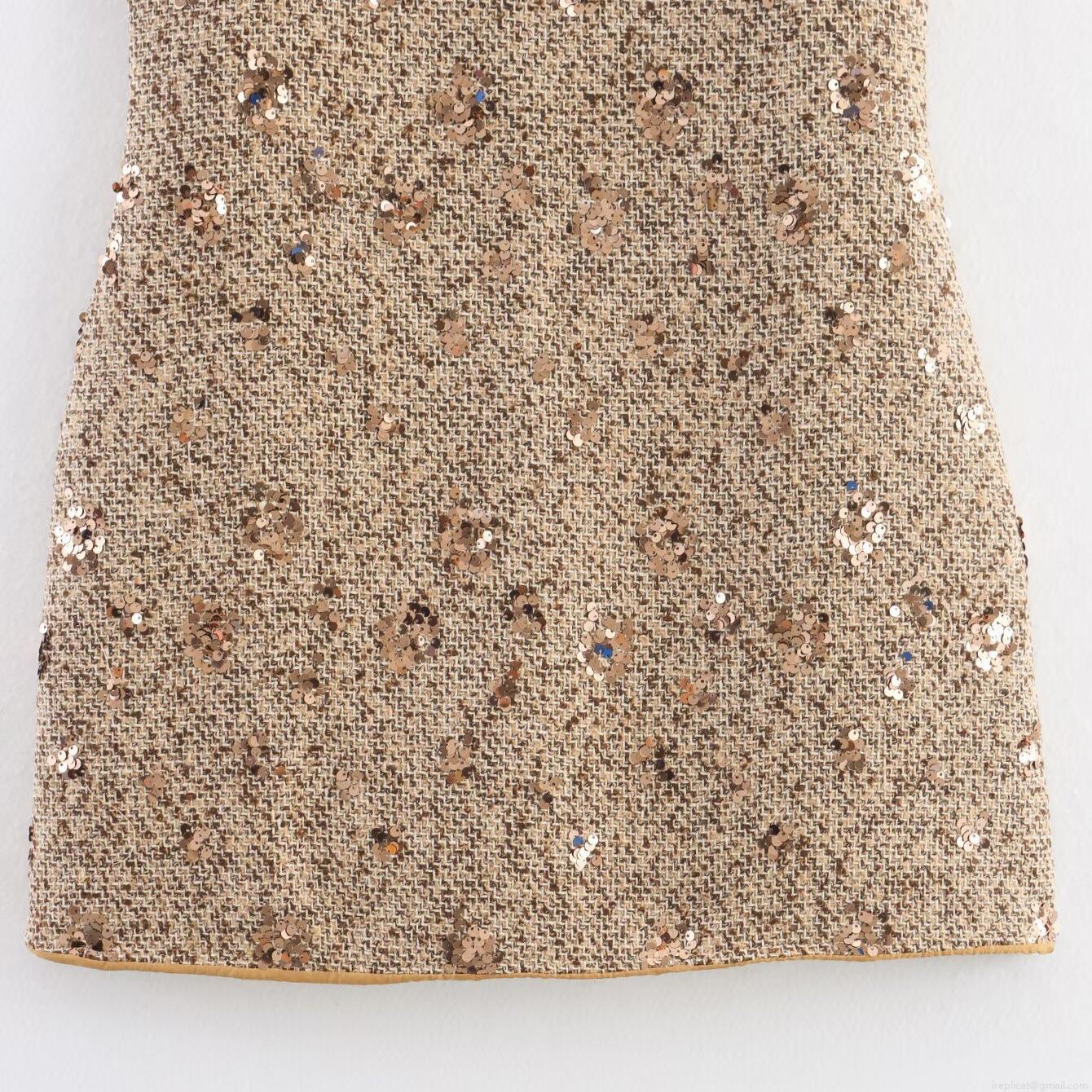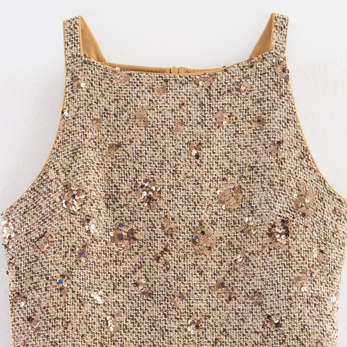 • Women Sexy Sequin Tweed Strappy Mini Dress Champagne Gold Off-Shoulder Sleeveless Bodycon Party Dress For Evening Banquet Lady Elegant Dress