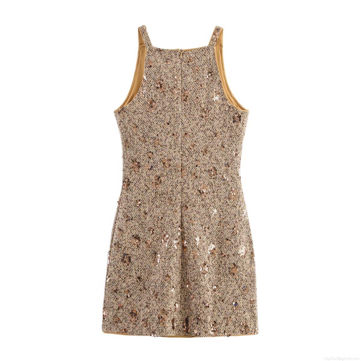Women Sexy Sequin Tweed Strappy Mini Dress Champagne Gold Off-Shoulder Sleeveless Bodycon Party Dress For Evening Banquet Lady Elegant Dress