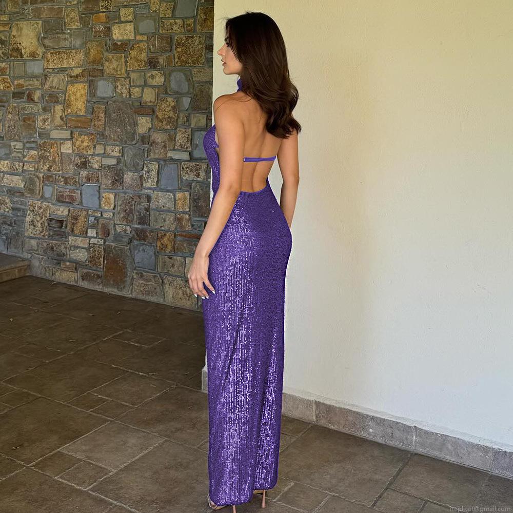 • Women Sexy Sequined Halter Backless Maxi Dress Elegant Polyester Bodycon Evening Gown For Party Cocktail Wedding Guest Clubwear