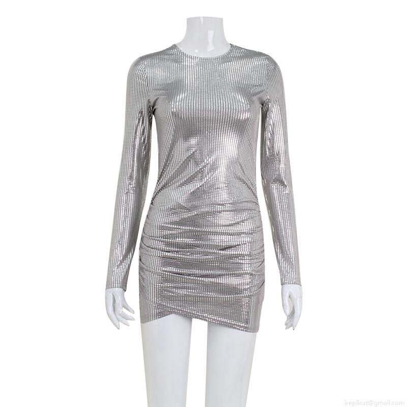 • Women Sexy Silver Foil Stamped Glitter Mini Dress Long Sleeve Round Neck Irregular Hem High Waist Bodycon Ruched Party Evening Cocktail Dress