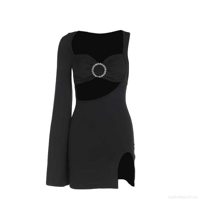 • Women Sexy Single Sleeve Mini Dress Asymmetrical Hollow Out Bodycon Slit Dress With Rhinestone Buckle For Christmas Party Night Club Wear