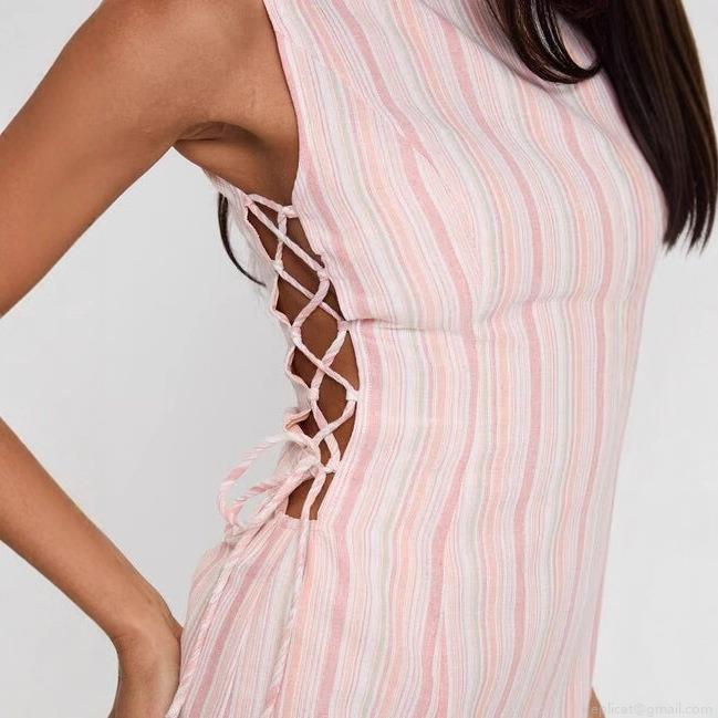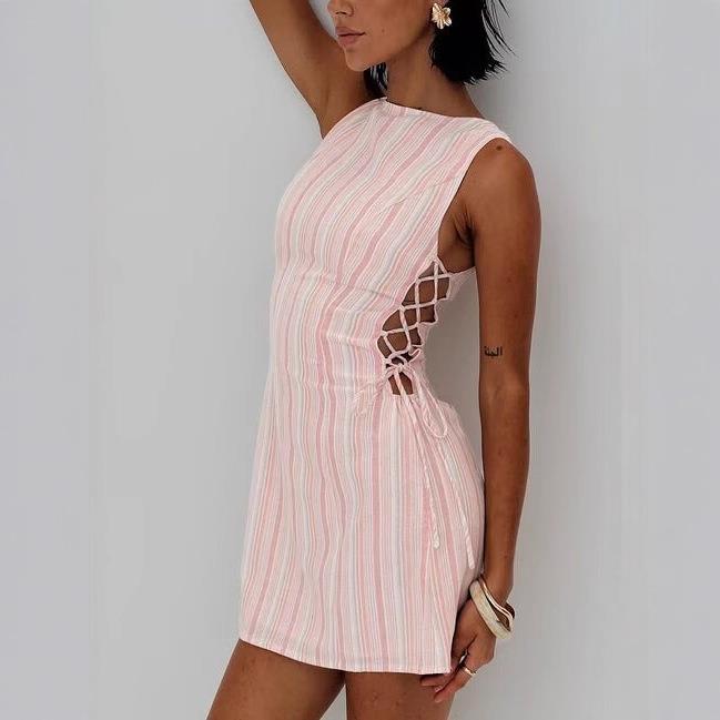 • Women Sexy Sleeveless Mini Dress Pink White Striped Bodycon Dress With Lace-up Side Hollow Out Detail Slim Fit Sleeveless Sundress For Women Summer Party Casual Wear