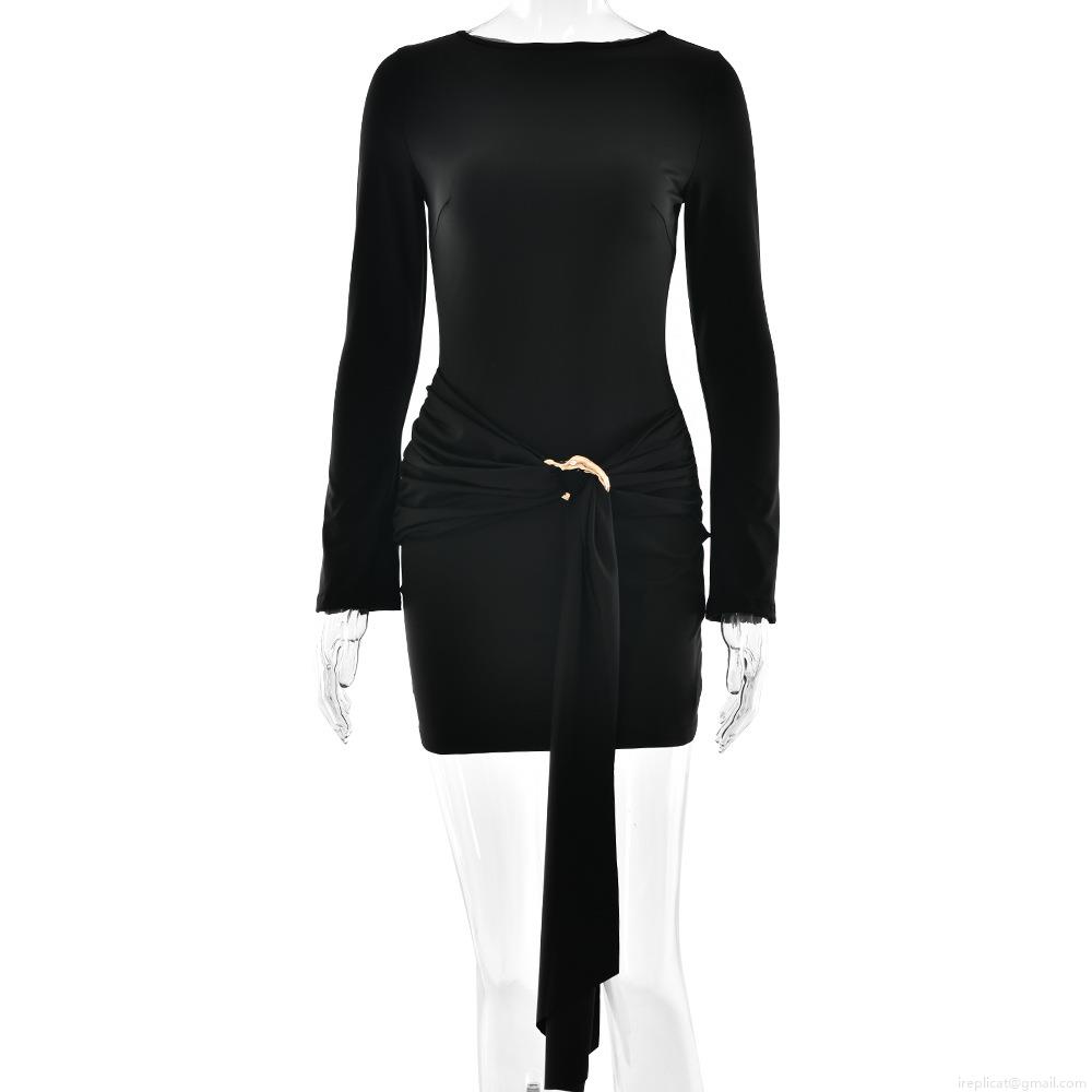 • Women Sexy Slim Fit Long Sleeve Mini Dress Solid Color Ruched Bodycon Dress With Metal Ring Side Drawstring Draped Party Clubwear Dress