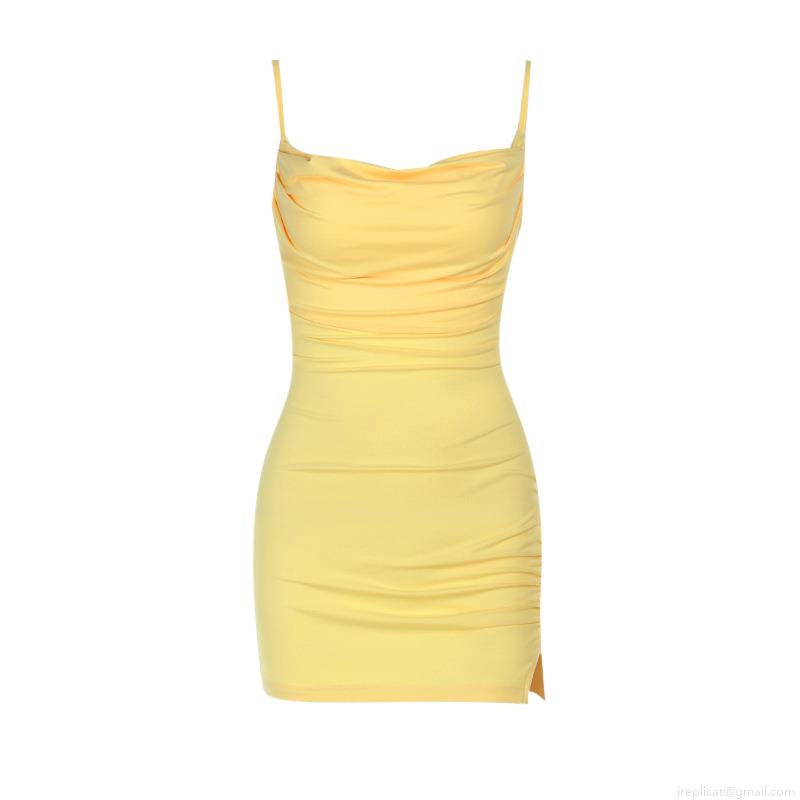 • Women Sexy Spaghetti Strap Ruched Mini Dress Backless Bowtie Summer Bodycon Dress Solid Color Side Slit Cowl Neck Party Clubwear