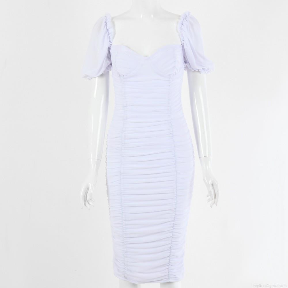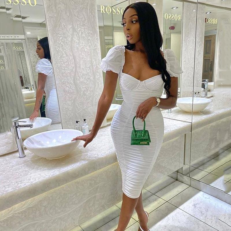 • Women Sexy Square Neck Ruched Puff Sleeve Bodycon Dress Slim Fit Solid Color Polyester Club Party Mini Dress